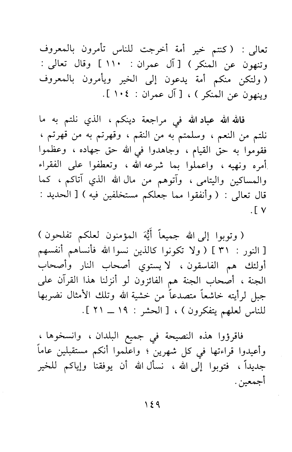 فالله الله عباد الله في مراجعة دينكم الذي نلتم به ما نلتم من النعم، وسلمتم به من النقم، وقهرتم به من قهرتم؛ فقوموا به حق القيام، وجاهدوا في الله حق جهاده، وعظموا أمره ونهيه؛ واعملوا بما شرعه الله، وتعطفوا على الفقراء والمساكين واليتامى، وآتوهم من مال الله الذي آتاكم، كما قال تعالى {جَعَلَكُمْ مُسْتَخْلَفِينَ فِيهِ فَالَّذِينَ آمَنُوا مِنْكُمْ وَأَنْفَقُوا لَهُمْ أَجْرٌ كَبِيرٌ} [سورة الحديد آية: 7] .