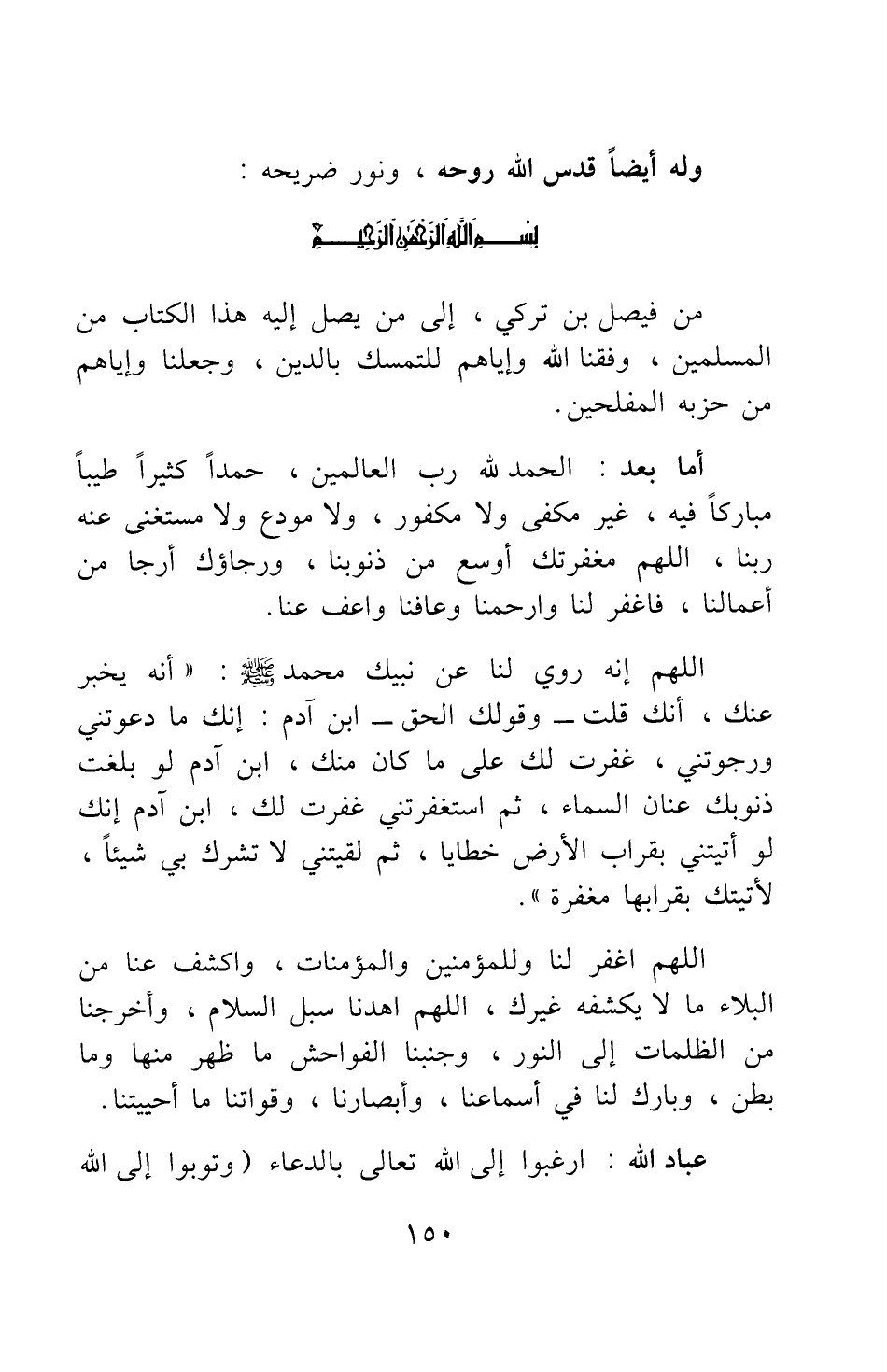 من فيصل بن تركي، إلى من يصل إليه هذا الكتاب من المسلمين، وفقنا الله وإياهم للتمسك بالدين، وجعلنا وإياهم من حزبه المفلحين.