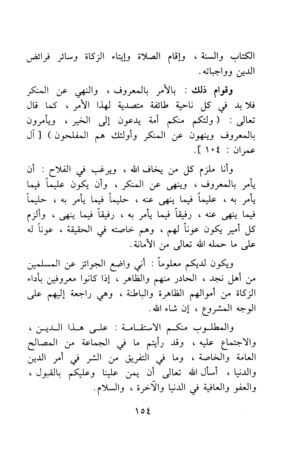 وقوام ذلك: بالأمر بالمعروف، والنهي عن المنكر، فلا بد في كل ناحية طائفة متصدية لهذا الأمر، كما قال تعالى: {وَلْتَكُنْ مِنْكُمْ أُمَّةٌ يَدْعُونَ إِلَى الْخَيْرِ وَيَأْمُرُونَ بِالْمَعْرُوفِ وَيَنْهَوْنَ عَنِ الْمُنْكَرِ وَأُولَئِكَ هُمُ الْمُفْلِحُونَ} [سورة آل عمران آية: 104] .