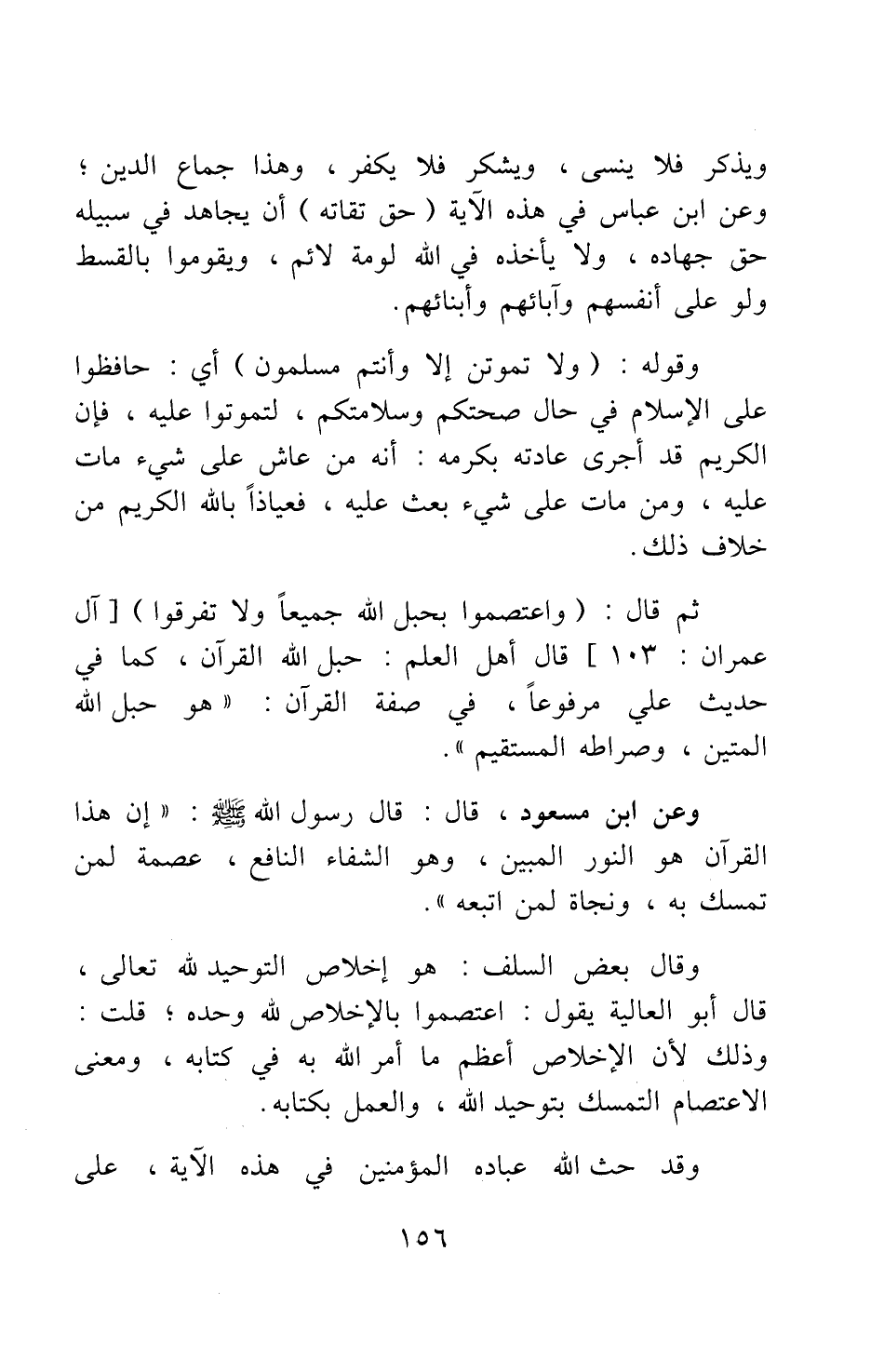 ثم قال: {وَاعْتَصِمُوا بِحَبْلِ اللَّهِ جَمِيعاً وَلا تَفَرَّقُوا} [سورة آل عمران آية: 103] ، قال أهل العلم: حبل الله القرآن، كما في حديث علي مرفوعا، في صفة القرآن: هو حبل الله المتين، وصراطه المستقيم 1.