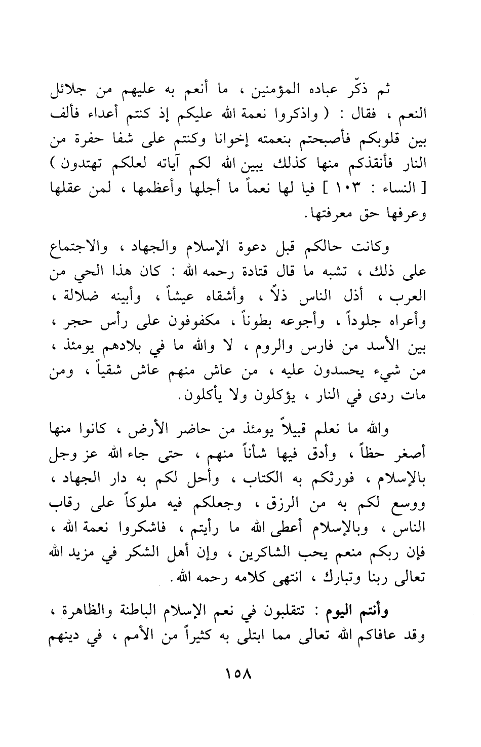 والله ما نعلم قبيلا يومئذ من حاضر الأرض، كانوا منها أصغر حظا، وأدق فيها شأنا منهم، حتى جاء الله عز وجل بالإسلام، فورثكم به الكتاب، وأحل لكم به دار الجهاد، ووسع لكم به من الرزق، وجعلكم فيه ملوكا على رقاب الناس. وبالإسلام أعطى الله ما رأيتم، فاشكروا نعمة الله، فإن ربكم منعم يحب الشاكرين، وإن أهل الشكر في مزيد الله تعالى ربنا وتبارك انتهى كلامه رحمه الله.