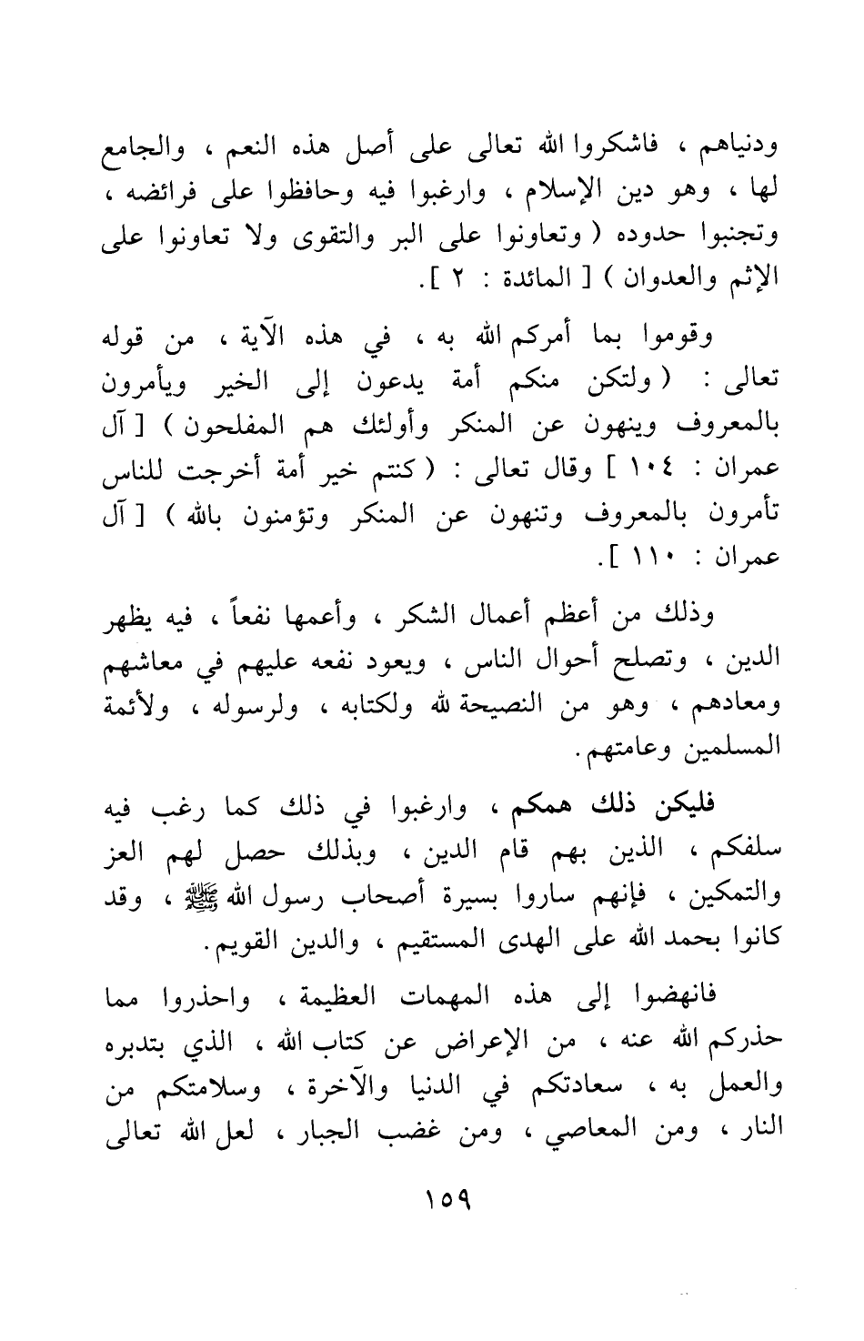 ودنياهم، فاشكروا الله تعالى على أصل هذه النعم، والجامع لها، وهو دين الإسلام، وارغبوا فيه وحافظوا على فرائضه، وتجنبوا حدوده {وَتَعَاوَنُوا عَلَى الْبِرِّ وَالتَّقْوَى وَلا تَعَاوَنُوا عَلَى الْأِثْمِ وَالْعُدْوَانِ} [سورة المائدة آية: 2] .