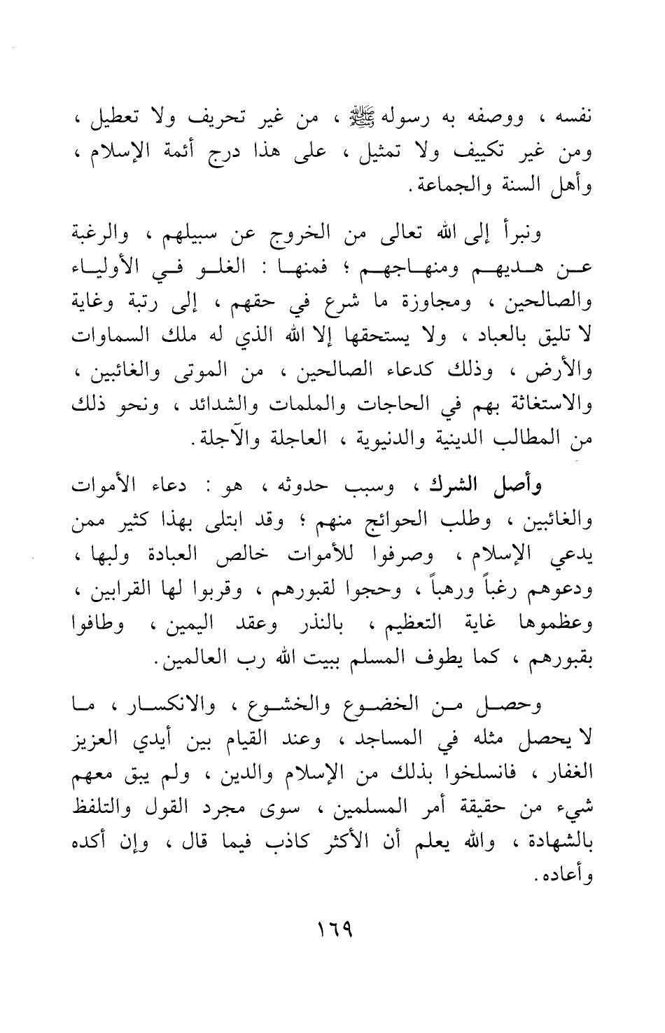 ونبرأ إلى الله تعالى من الخروج عن سبيلهم، والرغبة عن هديهم ومنهاجهم; فمنها: الغلو في الأولياء والصالحين، ومجاوزة ما شرع في حقهم إلى رتبة وغاية لا تليق بالعباد، ولا يستحقها إلا إلله الذي له ملك السماوات والأرض، وذلك كدعاء الصالحين من الموتى والغائبين، والاستغاثة بهم في الحاجات والملمات والشدائد، ونحو ذلك من المطالب الدينية والدنيوية العاجلة والآجلة.