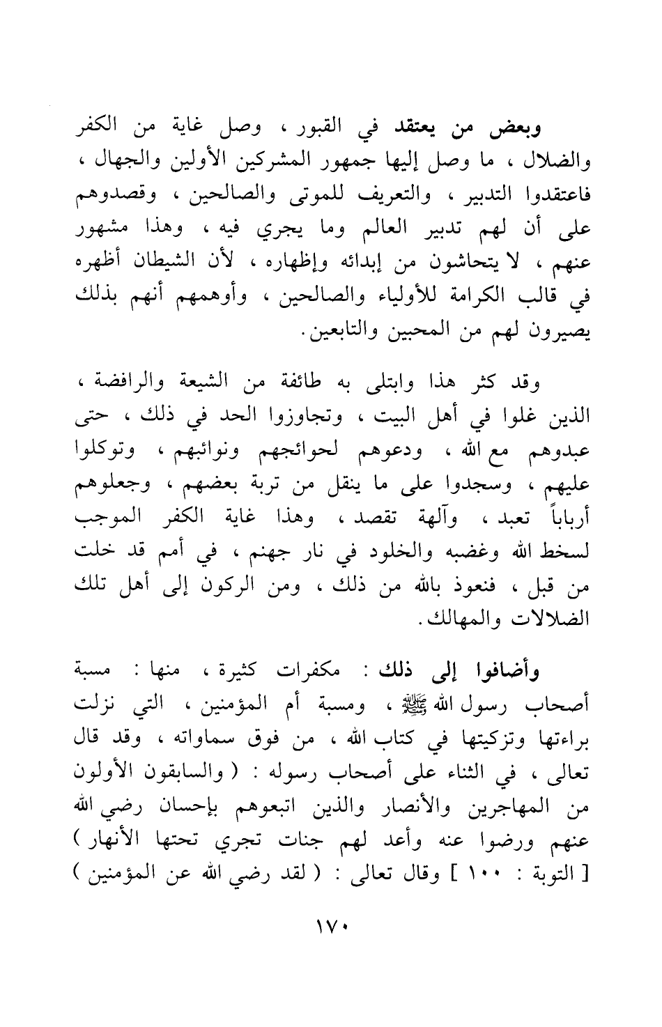 وبعض من يعتقد في القبور، وصل غاية من الكفر والضلال ما وصل إليها جمهور المشركين الأولين والجهال، فاعتقدوا التدبير، والتعريف للموتى والصالحين، وقصدوهم على أن لهم تدبير العالم وما يجري فيه، وهذا مشهور عنهم، لا يتحاشون من إبدائه وإظهاره، لأن الشيطان أظهره في قالب الكرامة للأولياء والصالحين، وأوهمهم أنهم بذلك يصيرون لهم من المحبين والتابعين.