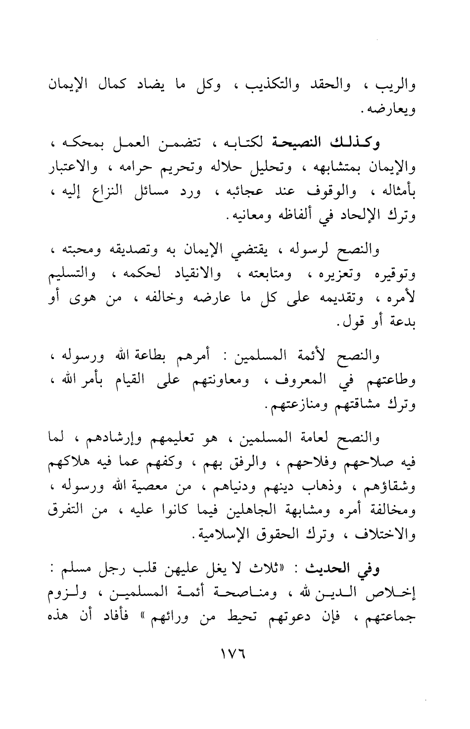 وكذلك النصيحة لكتابه، تتضمن العمل بمحكمه، والإيمان بمتشابهه، وتحليل حلاله وتحريم حرامه، والاعتبار بأمثاله، والوقوف عند عجائبه، ورد مسائل النّزاع إليه، وترك الإلحاد في ألفاظه ومعانيه.