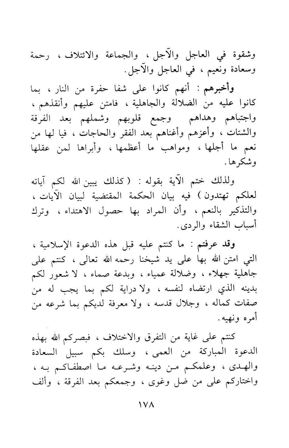 كنتم على غاية من التفرق والاختلاف، فبصركم الله بهذه الدعوة المباركة من العمى، وسلك بكم سبيل السعادة والهدى، وعلمكم من دينه وشرعه ما اصطفاكم به، واختاركم على من ضل وغوى، وجمعكم بعد الفرقة، وألف