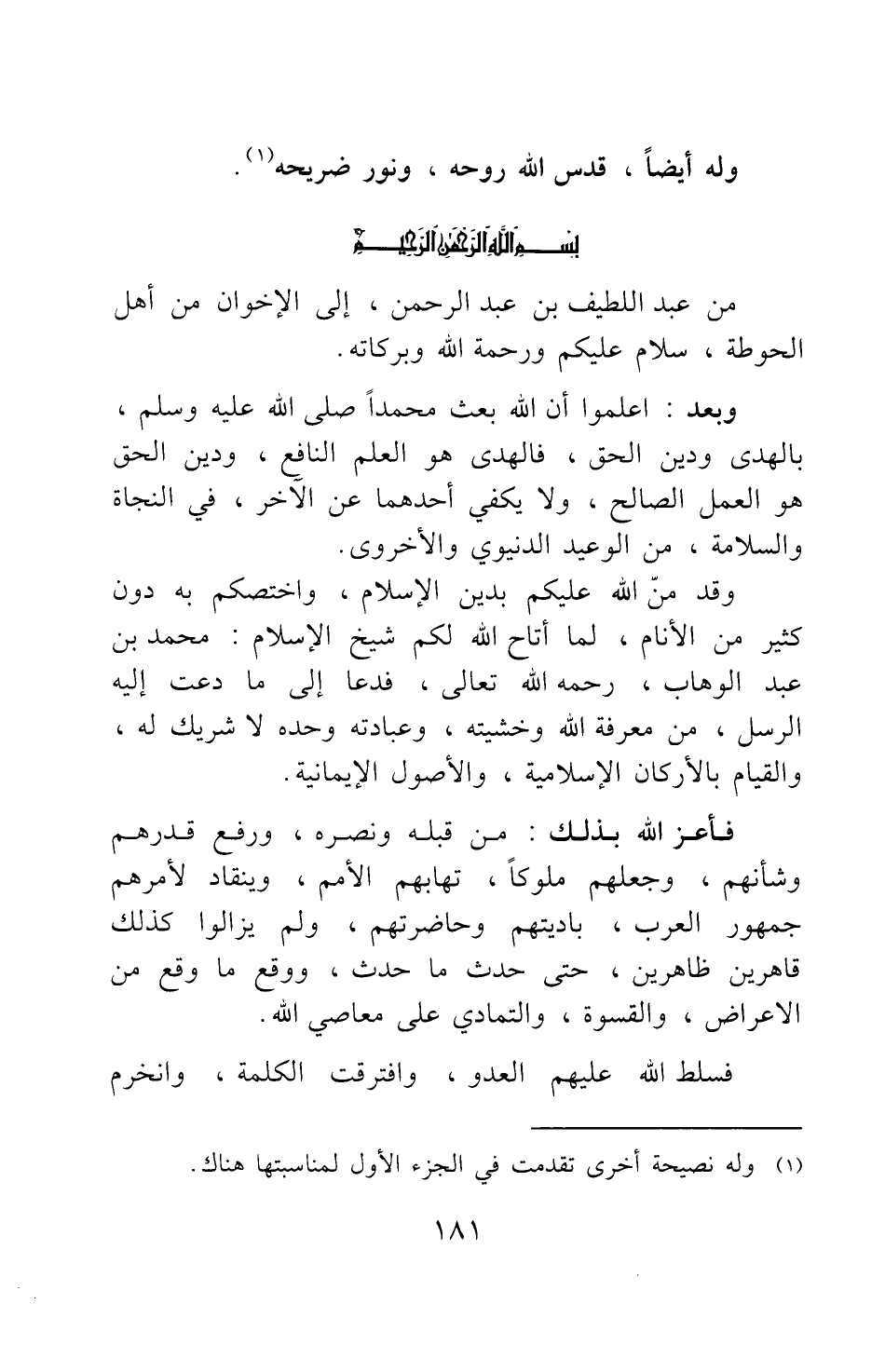 من عبد اللطيف بن عبد الرحمن، إلى الإخوان من أهل الحوطة، سلام عليكم ورحمة الله وبركاته.