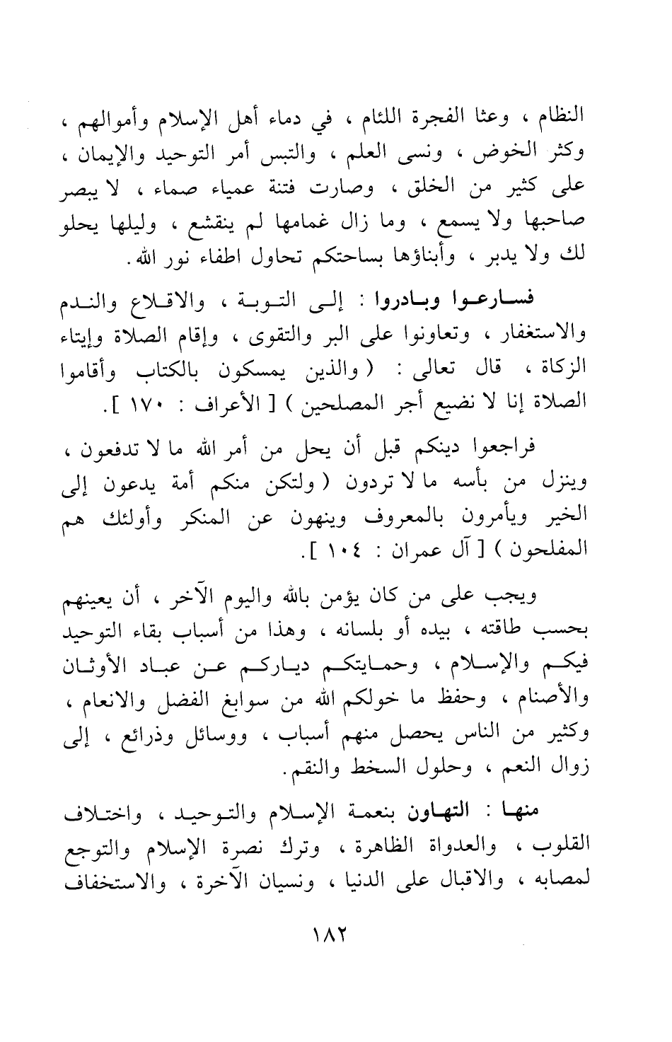 النظام، وعثا الفجرة اللئام، في دماء أهل الإسلام وأموالهم، وكثر الخوض، ونسي العلم، والتبس أمر التوحيد والإيمان على كثير من الخلق، وصارت فتنة عمياء صماء، لا يبصر صاحبها ولا يسمع، وما زال غمامها لم ينقشع، وليلها يحلو لك ولا يدبر، وأبناؤها بساحتكم تحاول إطفاء نور الله.