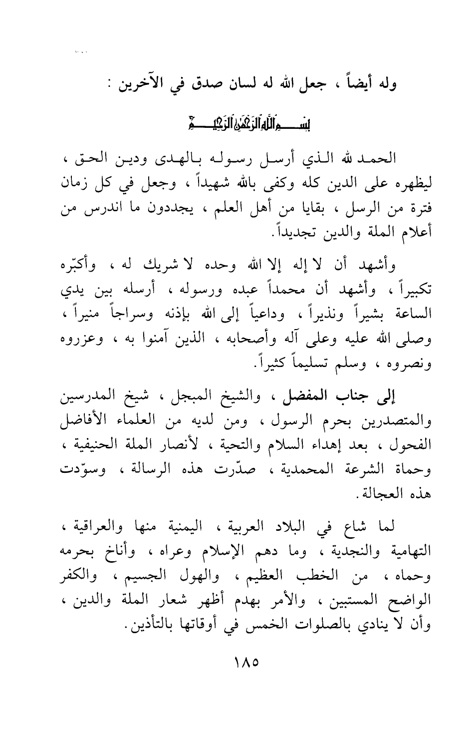 إلى جناب المفضل، والشيخ المبجل، شيخ المدرسين والمتصدرين بحرم الرسول، ومن لديه من العلماء الأفاضل الفحول، بعد إهداء السلام والتحية، لأنصار الملة الحنيفية، وحماة الشرعة المحمدية، صدرت هذه الرسالة، وسودت هذه العجالة.