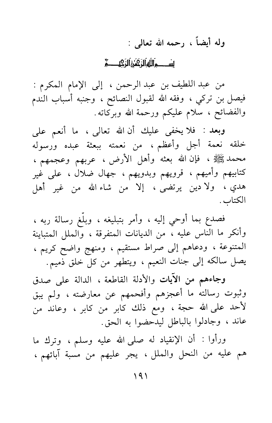 صلى الله عليه وسلم [رسالة الشيخ عبد اللطيف بن عبد الرحمن إلى الإمام فيصل بن تركي يذكره بنعمة الله على خلقه وهي بعثة سيدنا محمد]