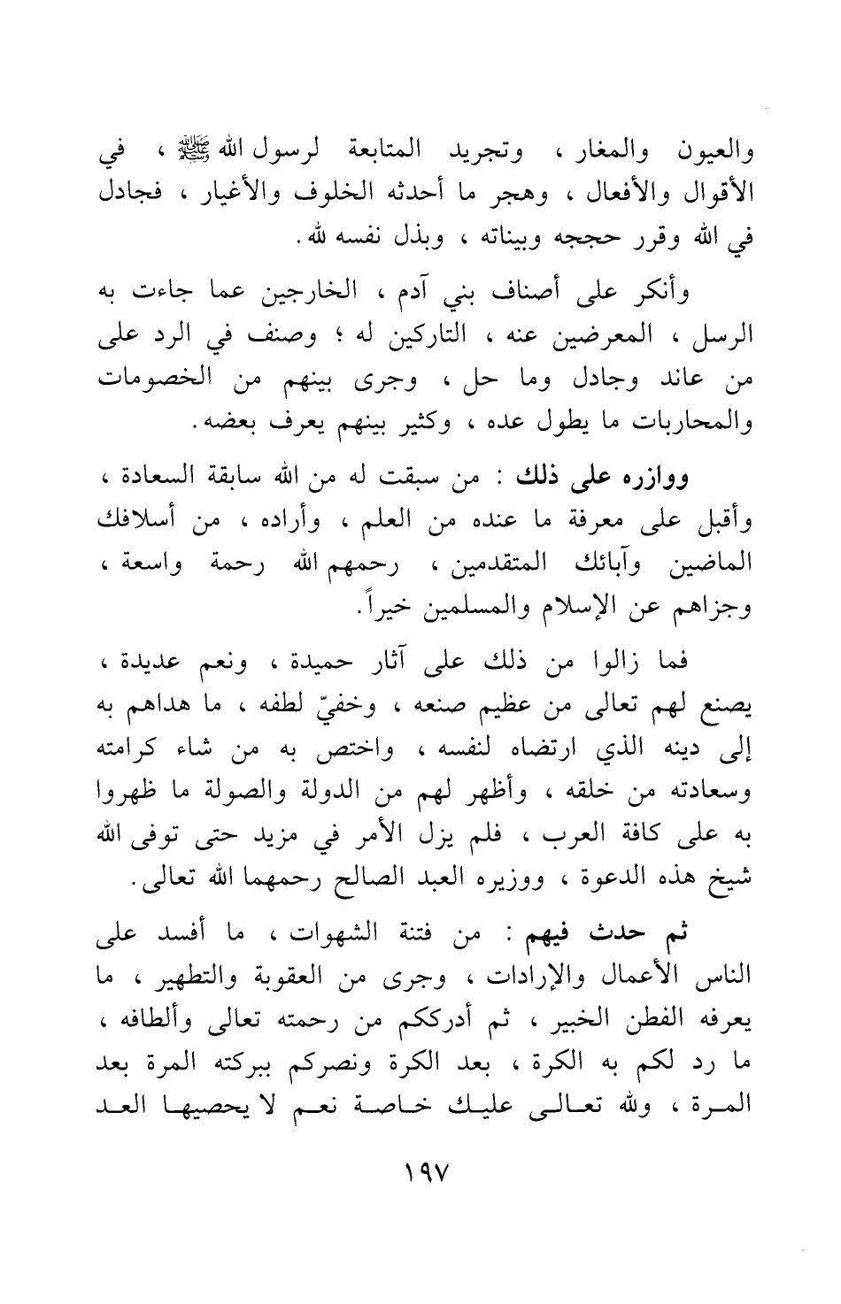 فما زالوا من ذلك على آثار حميدة، ونعم عديدة، يصنع لهم تعالى من عظيم صنعه وخفي لطفه، ما هداهم به إلى دينه الذي ارتضاه لنفسه، واختص به من شاء كرامته وسعادته من خلقه، وأظهر لهم من الدولة والصولة ما ظهروا به على كافة العرب، فلم يزل الأمر في مزيد حتى توفى الله شيخ هذه الدعوة، ووزيره العبد الصالح رحمهما الله تعالى.