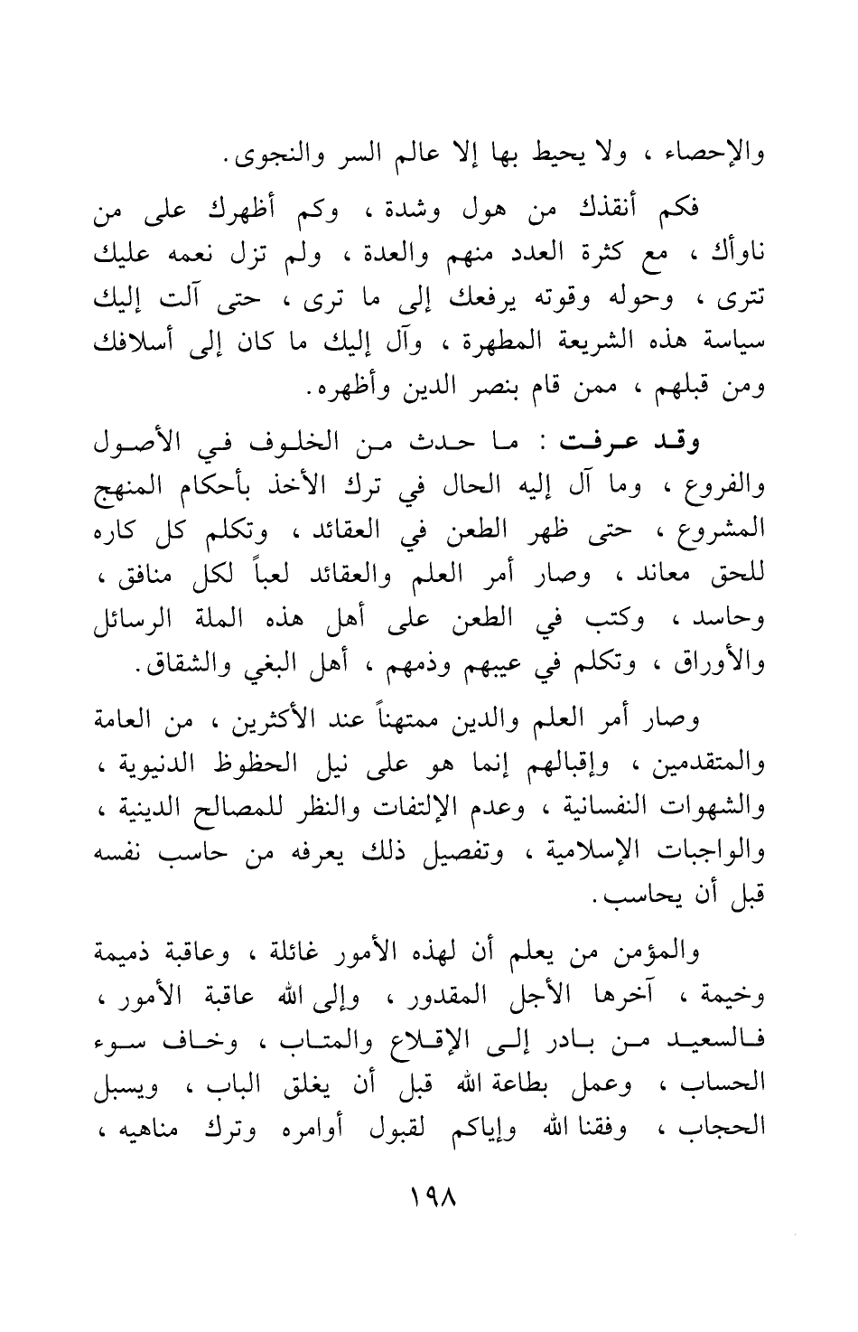 وصار أمر العلم والدين ممتهنا عند الأكثرين، من العامة والمتقدمين، وإقبالهم إنما هو على نيل الحظوظ الدنيوية، والشهوات النفسانية، وعدم الالتفات والنظر للمصالح الدينية، والواجبات الإسلامية؛ وتفصيل ذلك يعرفه من حاسب نفسه قبل أن يحاسب.