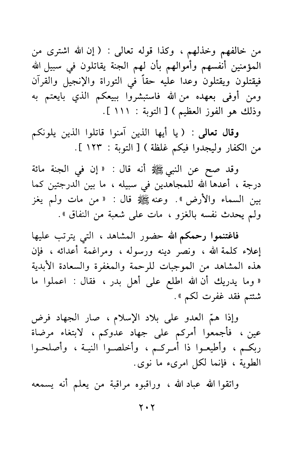 وإذا هم العدو على بلاد الإسلام، صار الجهاد فرض عين فأجمعوا أمركم على جهاد عدوكم، لابتغاء مرضاة ربكم، وأطيعوا ذا أمركم، وأخلصوا النية، وأصلحوا الطوية، فإنما لكل امرئ ما نوى.