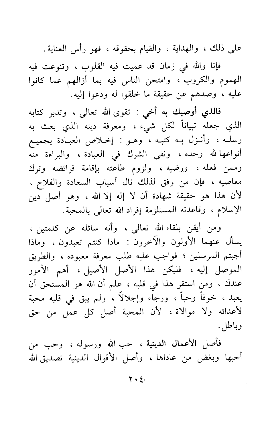 فالذي أوصيك به أخي: تقوى الله تعالى، وتدبر كتابه الذي جعله تبيانا لكل شيء، ومعرفة دينه الذي بعث به رسله، وأنزل به كتبه، وهو: إخلاص العبادة بجميع أنواعها لله وحده، ونفي الشرك في العبادة، والبراءة منه وممن فعله ورضيه، ولزوم طاعته بإقامة فرائضه وترك معاصيه، فإن من وفق لذلك نال أسباب السعادة والفلاح، لأن هذا هو حقيقة شهادة أن لا إله إلا الله، وهو أصل دين الإسلام، وقاعدته المستلزمة إفراد الله تعالى بالمحبة.