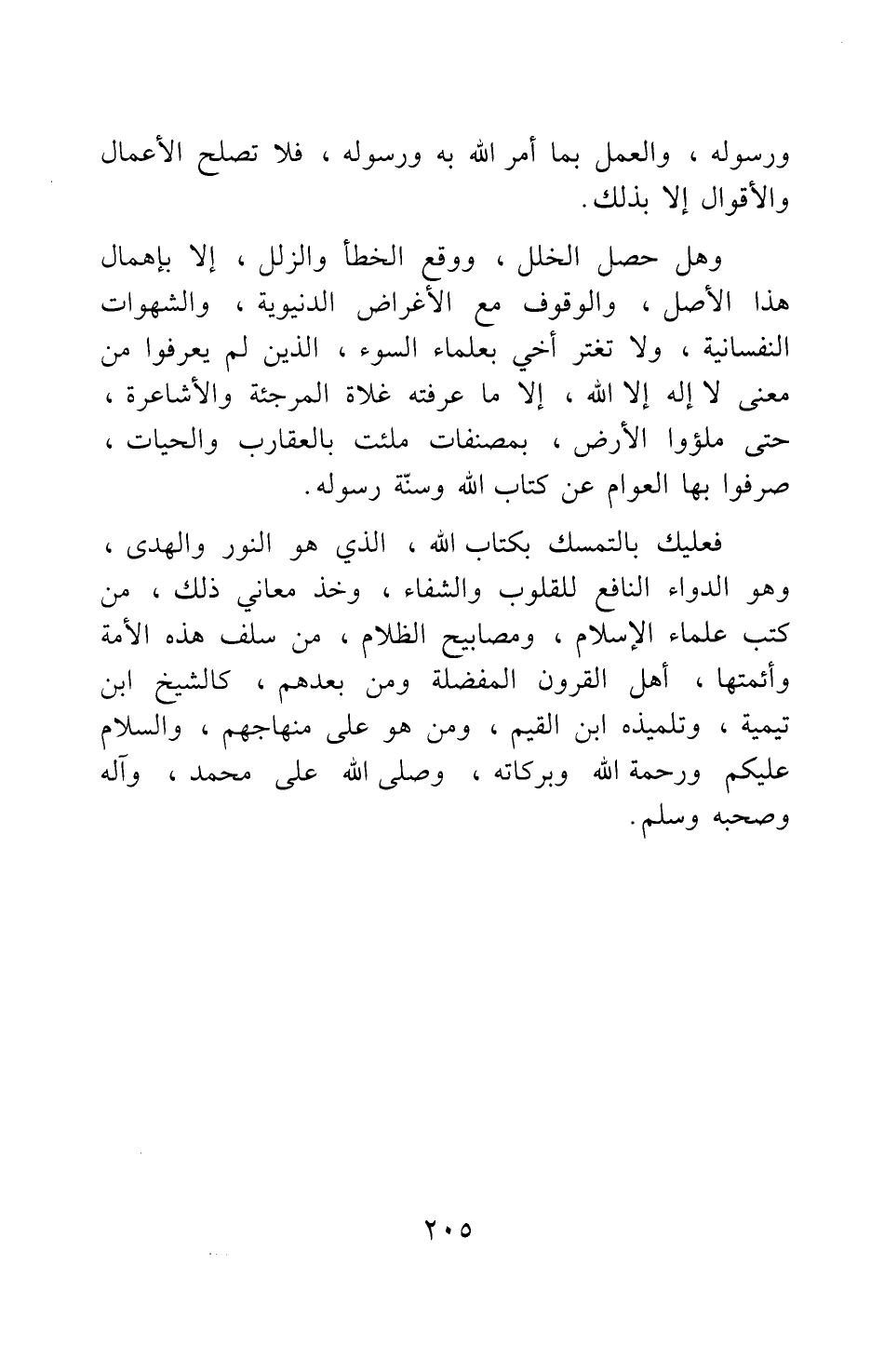 فعليك بالتمسك بكتاب الله الذي هو النور والهدى، وهو الدواء النافع للقلوب والشفاء، وخذ معاني ذلك من كتب علماء الإسلام، ومصابيح الظلام، من سلف هذه الأمة وأئمتها، أهل القرون المفضلة ومن بعدهم، كالشيخ ابن تيمية، وتلميذه ابن القيم، ومن هو على منهاجهم. والسلام عليكم ورحمة الله وبركاته، وصلى الله على محمد، وآله وصحبه وسلم.