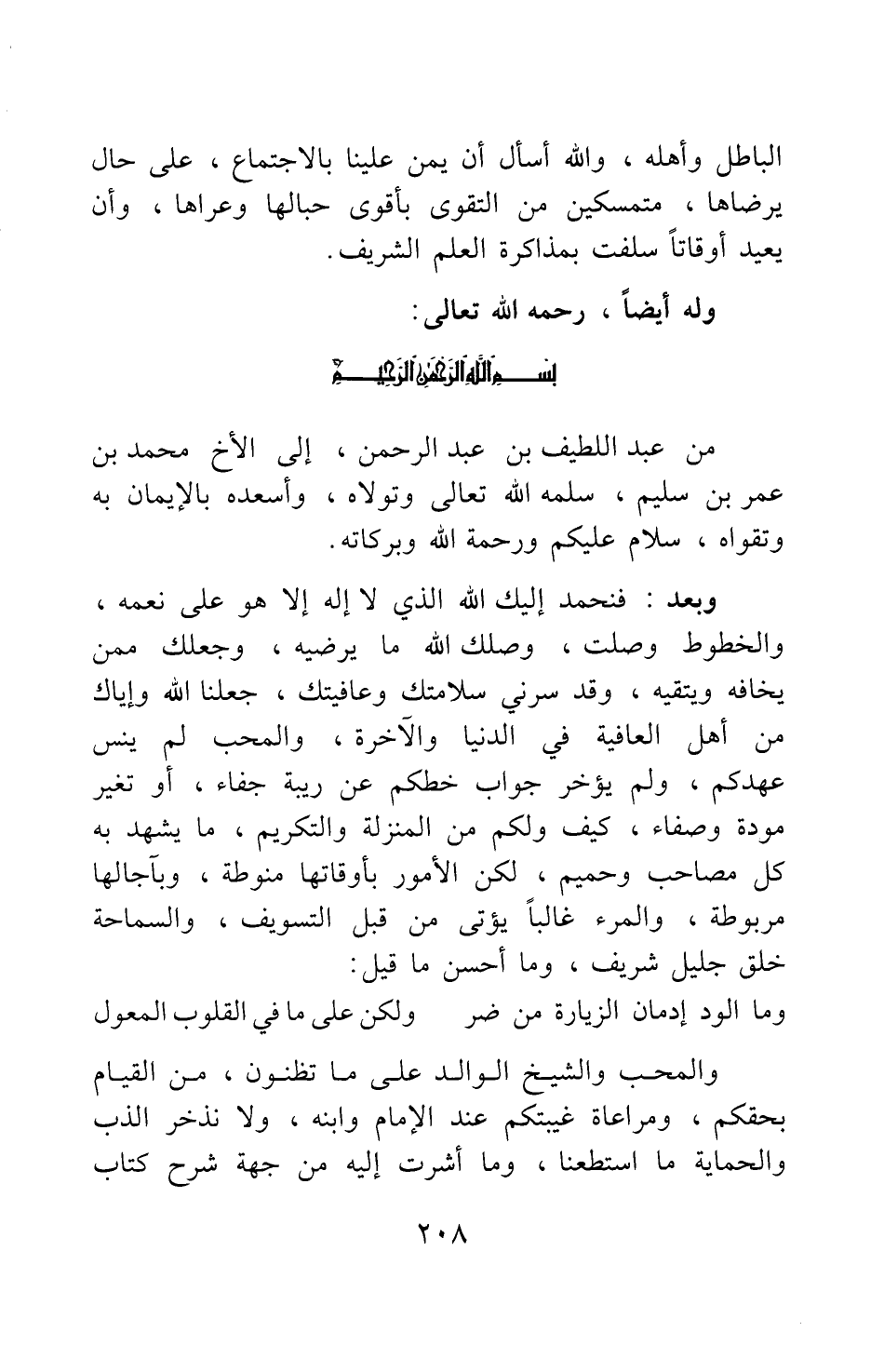 من عبد اللطيف بن عبد الرحمن، إلى الأخ محمد بن عمر بن سليم، سلمه الله تعالى وتولاه، وأسعده بالإيمان به وتقواه، سلام عليكم ورحمة الله وبركاته.