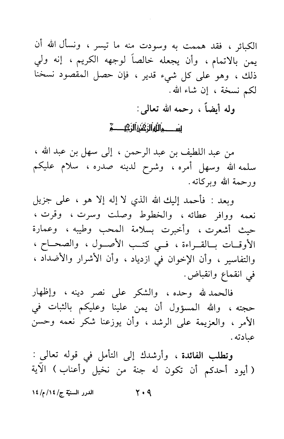 من عبد اللطيف بن عبد الرحمن، إلى سهل بن عبد الله، سلمه الله وسهل أمره، وشرح لدينه صدره، سلام عليكم ورحمة الله وبركاته.