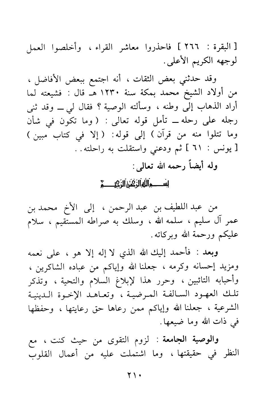 من عبد اللطيف بن عبد الرحمن، إلى الأخ محمد بن عمر آل سليم، سلمه الله، وسلك به صراطه المستقيم، سلام عليكم ورحمة الله وبركاته.