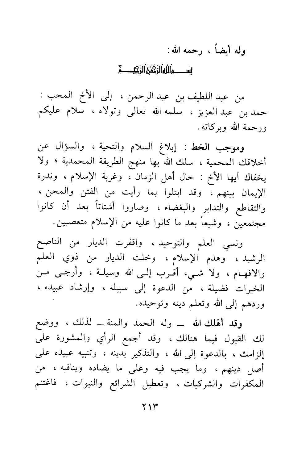من عبد اللطيف بن عبد الرحمن، إلى الأخ المحب: حمد بن عبد العزيز، سلمه الله تعالى وتولاه، سلام عليكم ورحمة الله وبركاته.