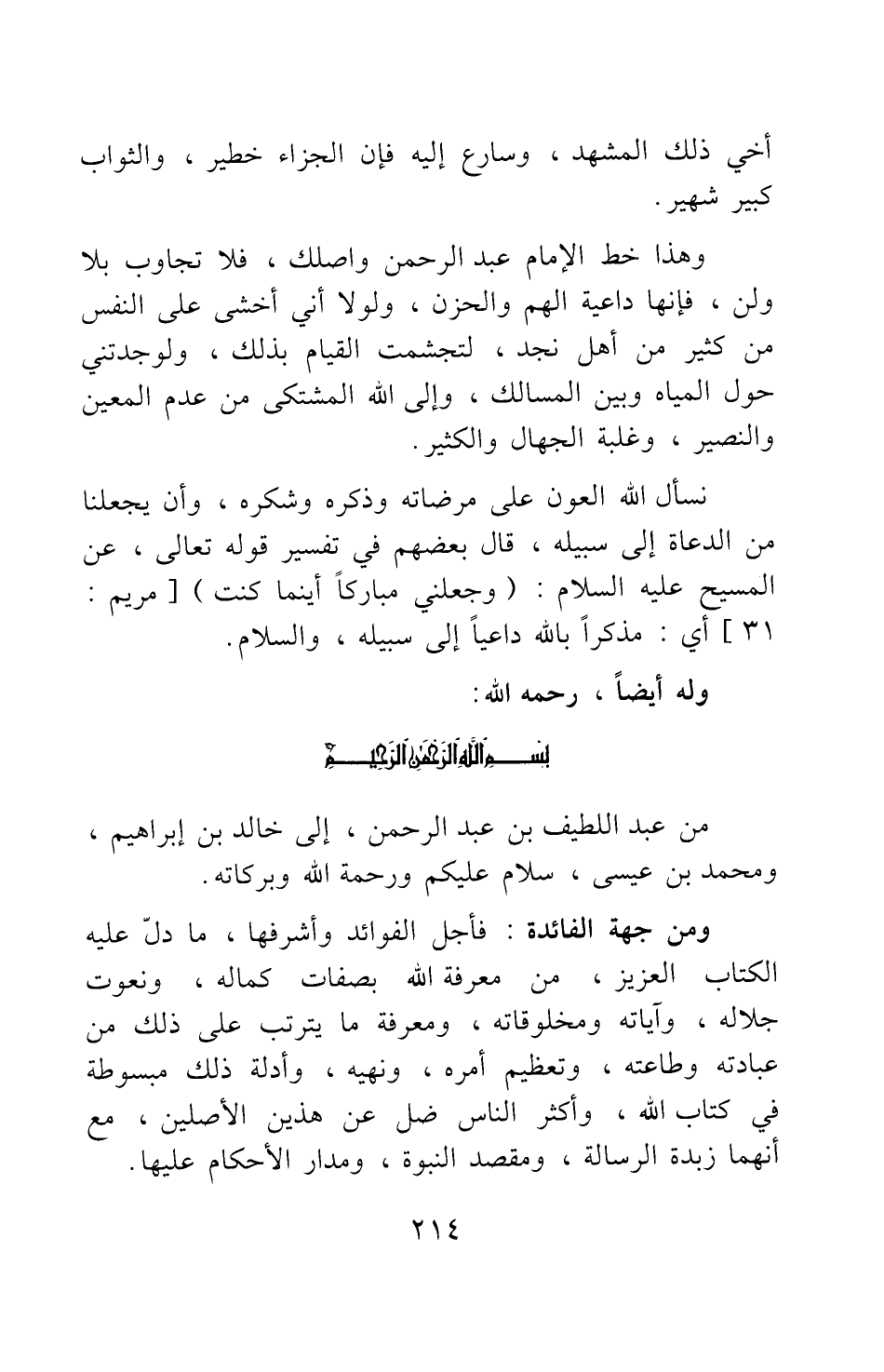 أخي ذلك المشهد، وسارع إليه فإن الجزاء خطير، والثواب كبير شهير. وهذا خط الإمام عبد الرحمن وأصلك فلا تجاوب بلا ولن، فإنها داعية الهم والحزن، ولولا أني أخشى على النفس من كثير من أهل نجد، لتجشمت القيام بذلك، ولوجدتني حول المياه وبين المسالك، وإلى الله المشتكى من عدم المعين والنصير، وغلبة الجهال والكثير.