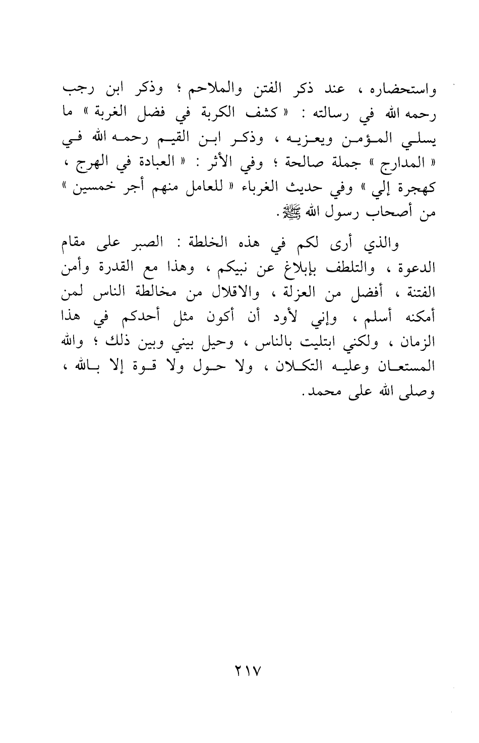 واستحضاره، عند ذكر الفتن والملاحم; وذكر ابن رجب رحمه الله في رسالته: "كشف الكربة في فضل الغربة" ما يسلي المؤمن ويعزيه. وذكر ابن القيم رحمه الله في المدارج جملة صالحة; وفي الأثر: العبادة في الهرج، كهجرة إليَّ 1، وفي حديث الغرباء: للعامل منهم أجر خمسين من أصحاب رسول الله صلى الله عليه وسلم 2.