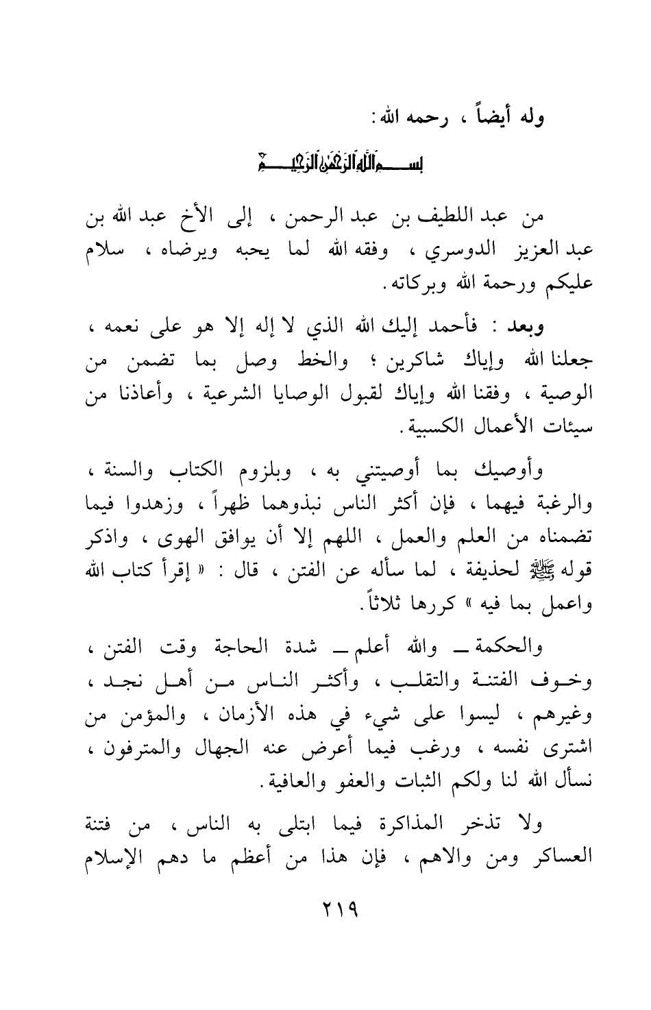 من عبد اللطيف بن عبد الرحمن، إلى الأخ عبد الله بن عبد العزيز الدوسري، وفقه الله لما يحبه ويرضاه، سلام عليكم ورحمة الله وبركاته.