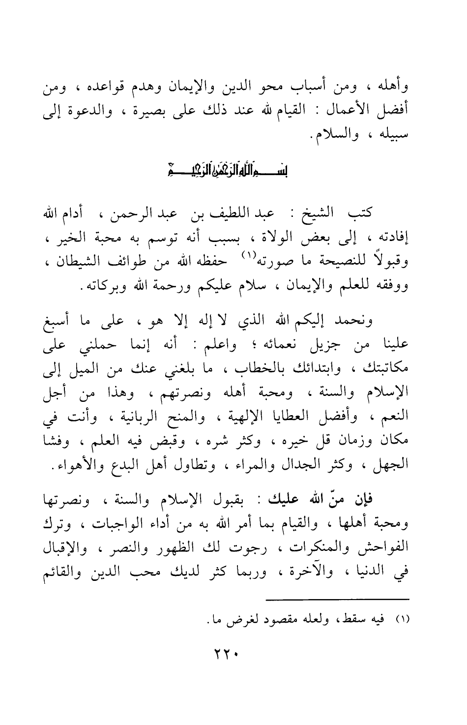 كتب الشيخ: عبد اللطيف بن عبد الرحمن، أدام الله إفادته، إلى بعض الولاة، بسبب أنه توسم به محبة الخير وقبولا للنصيحة ما صورته 1 حفظه الله من طوائف الشيطان، ووفقه للعلم والإيمان، سلام عليكم ورحمة الله وبركاته.