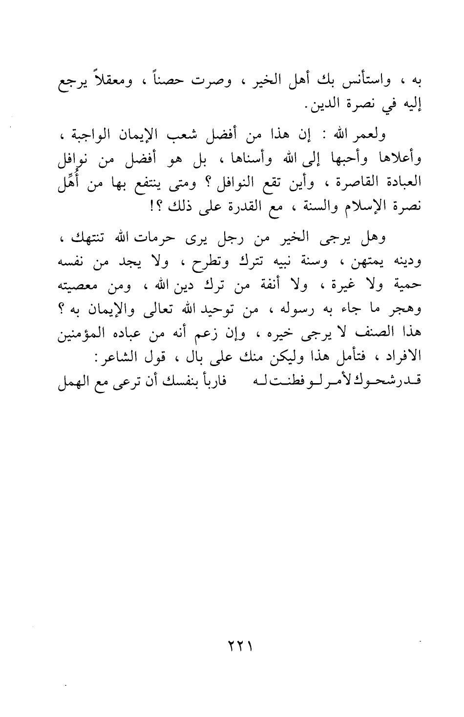 ولعمر الله إن هذا من أفضل شعب الإيمان الواجبة، وأعلاها وأحبها إلى الله وأسناها، بل هو أفضل من نوافل العبادة القاصرة، وأين تقع النوافل؟ ومتى ينتفع بها من أهل نصرة الإسلام والسنة، مع القدرة على ذلك؟! وهل يرجى الخير من رجل يرى حرمات الله تنتهك، ودينه يمتهن، وسنة نبيه تترك وتطرح، ولا يجد من نفسه حمية ولا غيرة، ولا أنفة من ترك دين الله، ومن معصيته وهجو ما جاء به رسوله، من توحيد الله تعالى والإيمان به؟ هذا الصنف لا يرجى خيره، وإن زعم أنه من عباده المؤمنين الأفراد، فتأمل هذا وليكن منك على بال، قول الشاعر: