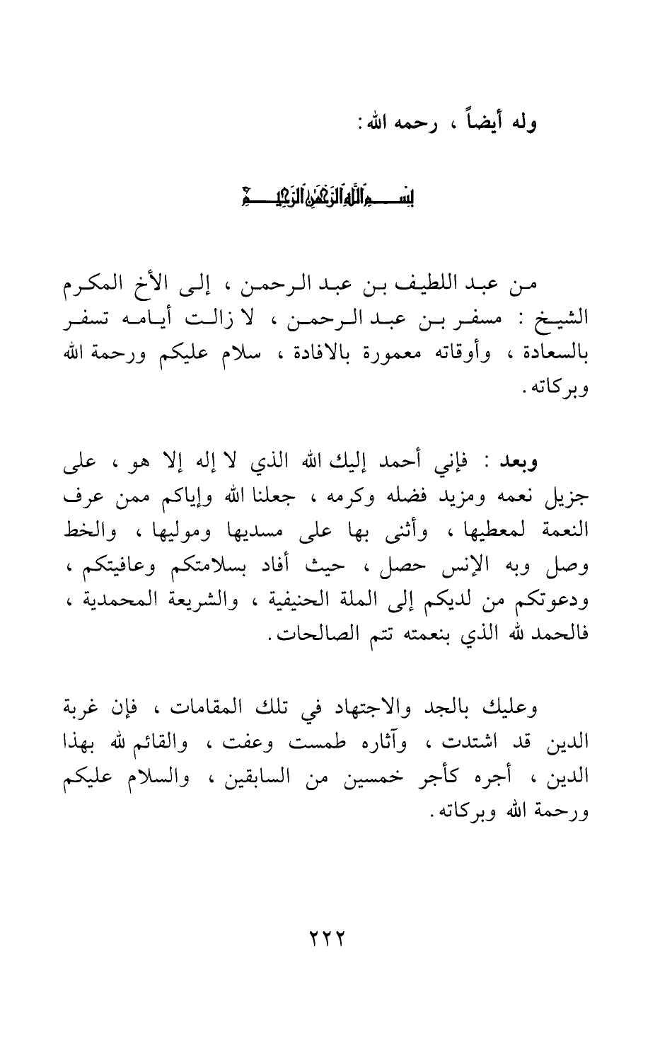 من عبد اللطيف بن عبد الرحمن، إلى الأخ المكرم الشيخ: مسفر بن عبد الرحمن، لا زالت أيامه تسفر بالسعادة، وأوقاته معمورة بالإفادة، سلام عليكم ورحمة الله وبركاته.