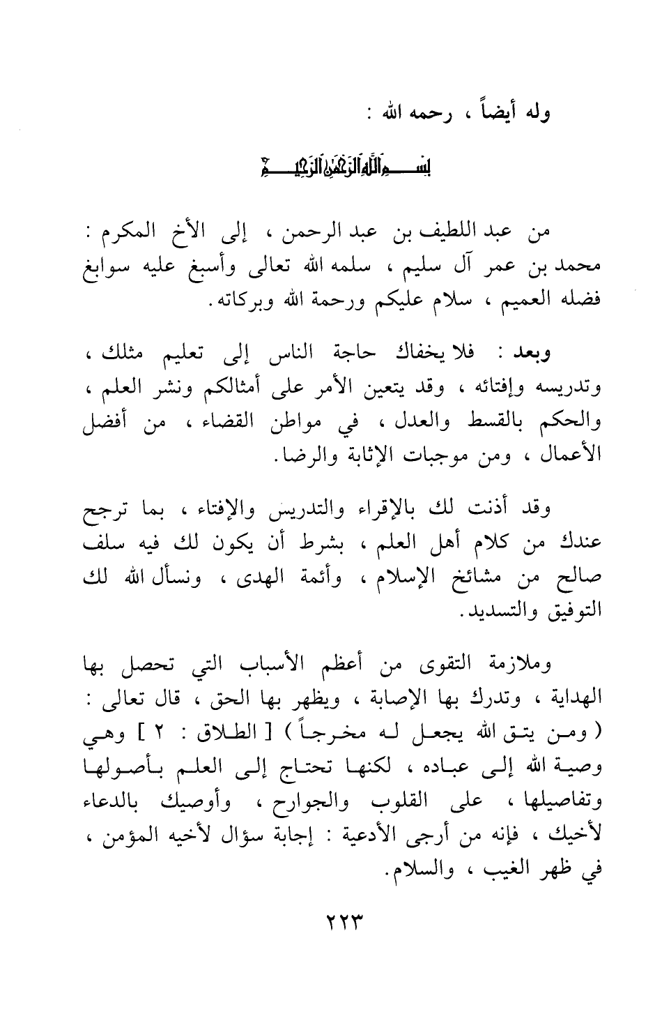 من عبد اللطيف بن عبد الرحمن، إلى الأخ المكرم: محمد بن عمر آل سليم، سلمه الله تعالى وأسبغ عليه سوابغ فضله العميم، سلام عليكم ورحمة الله وبركاته.