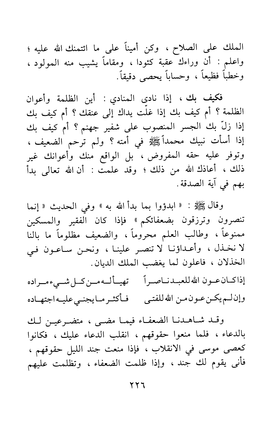 فكيف بك، إذا نادى المنادي: أين الظلمة وأعوان الظلمة؟ أم كيف بك إذا غلت يداك إلى عنقك؟ أم كيف بك إذا زل بك الجسر المنصوب على شفير جهنم؟ أم كيف بك إذا أسأت نبيك محمد صلى الله عليه وسلم في أمته؟ ولم ترحم الضعيف، وتوفر عليه حقه المفروض، بل الواقع منك وأعوانك غير ذلك، أعاذك الله من ذلك; وقد علمت أن الله تعالى بدأ بهم في آية الصدقة.