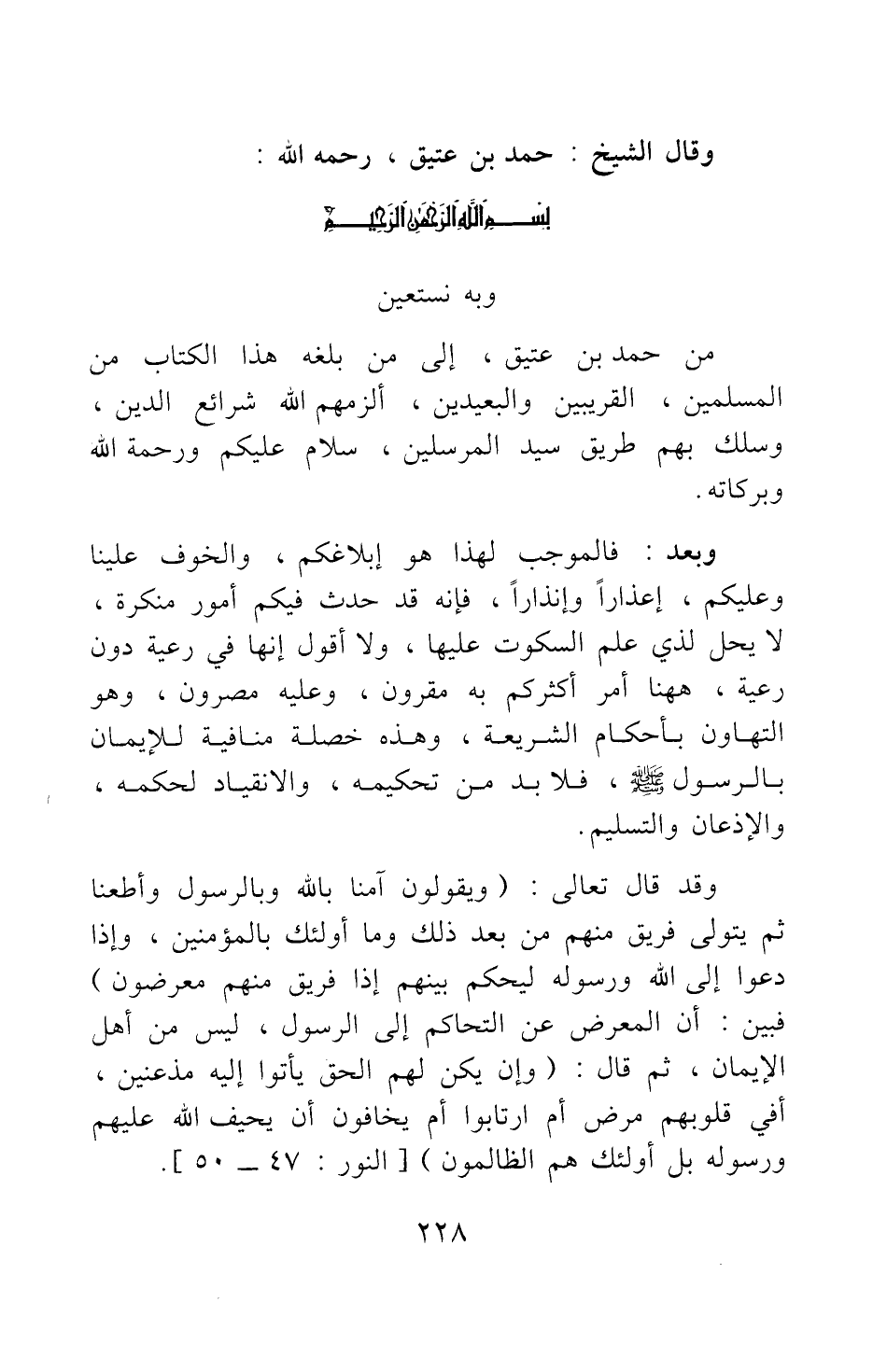 من حمد بن عتيق، إلى من بلغه هذا الكتاب من المسلمين، القريبين والبعيدين، ألزمهم الله شرائع الدين، وسلك بهم طريق سيد المرسلين، سلام عليكم ورحمة الله وبركاته.
