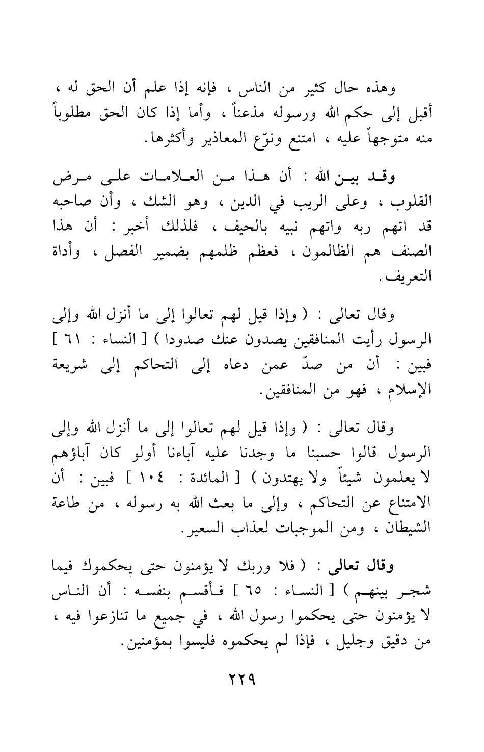 وقال تعالى: {وَإِذَا قِيلَ لَهُمْ تَعَالَوْا إِلَى مَا أَنْزَلَ اللَّهُ وَإِلَى الرَّسُولِ رَأَيْتَ الْمُنَافِقِينَ يَصُدُّونَ عَنْكَ صُدُوداً} [سورة النساء آية: 61] ، فَبَيَّن أن من صد عمن دعاه إلى التحاكم إلى شريعة الإسلام، فهو من المنافقين.