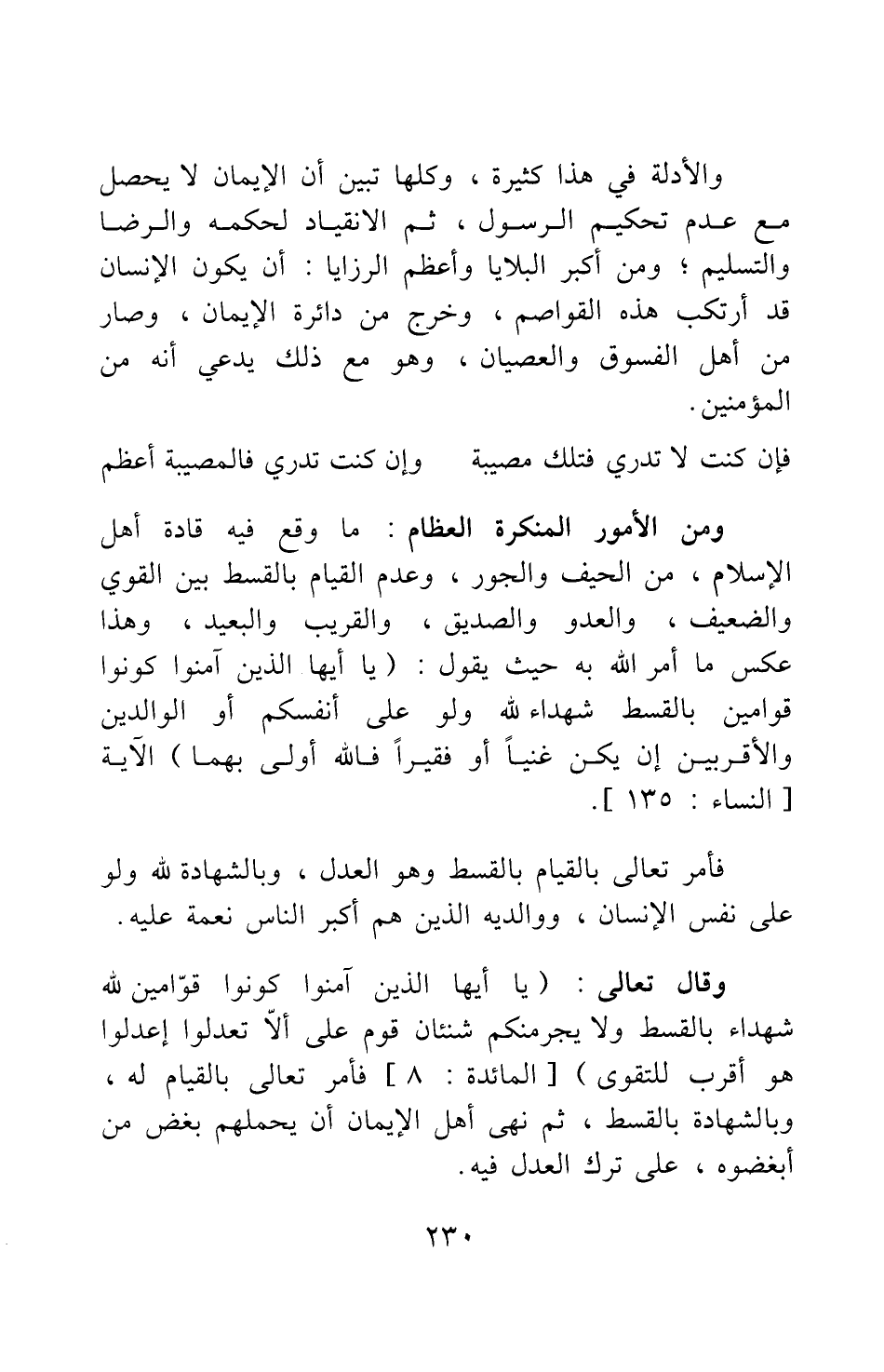 ومن الأمور المنكرة العظام: ما وقع فيه قادة أهل الإسلام، من الحيف والجور، وعدم القيام بالقسط بين القوي والضعيف، والعدو والصديق، والقريب والبعيد؛ وهذا عكس ما أمر الله به حيث يقول: {يَا أَيُّهَا الَّذِينَ آمَنُوا كُونُوا قَوَّامِينَ بِالْقِسْطِ شُهَدَاءَ لِلَّهِ وَلَوْ عَلَى أَنْفُسِكُمْ أَوِ الْوَالِدَيْنِ وَالْأَقْرَبِينَ إِنْ يَكُنْ غَنِيّاً أَوْ فَقِيراً فَاللَّهُ أَوْلَى بِهِمَا} [سورة النساء آية: 135] الآية.