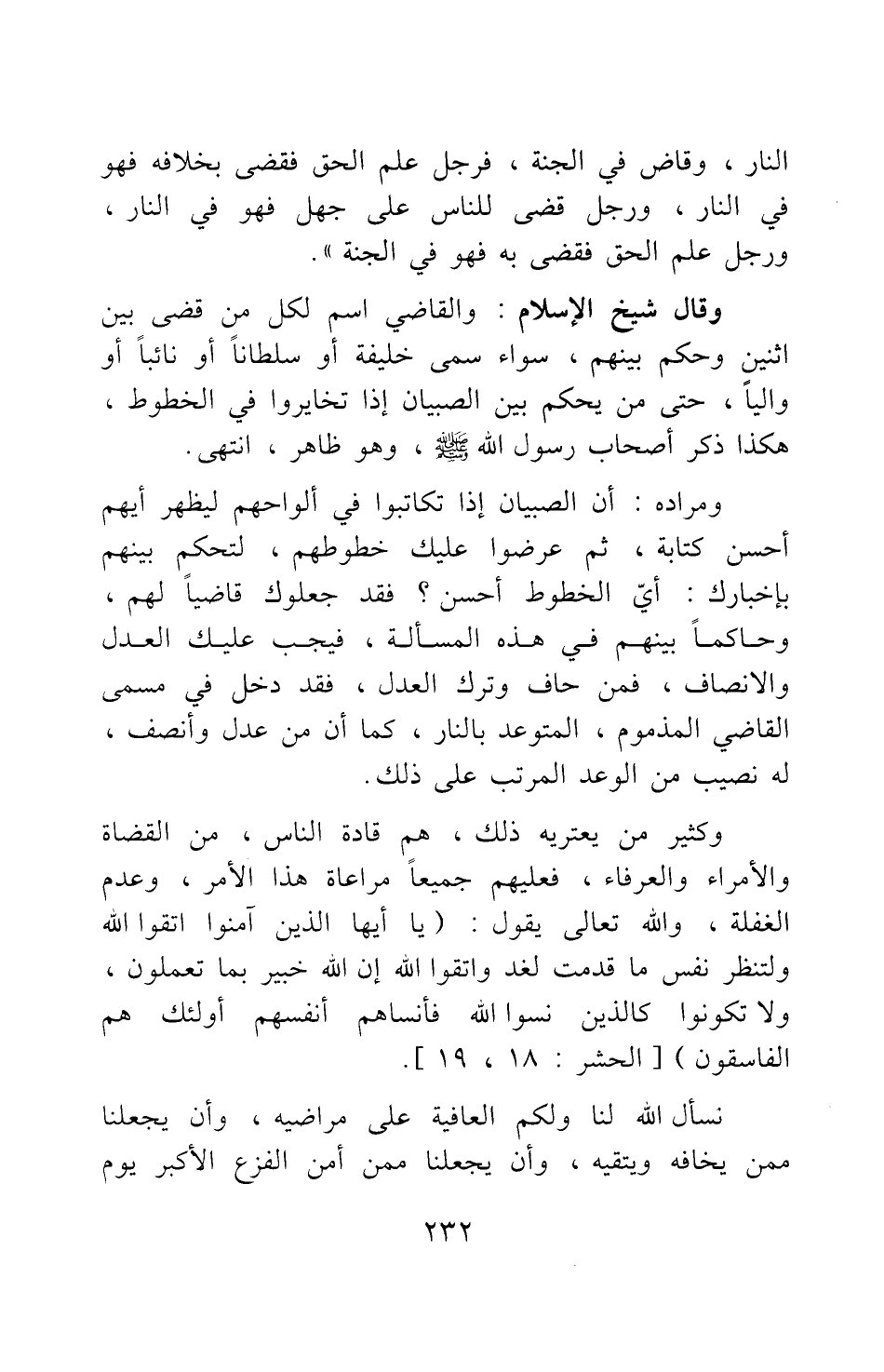 ومراده: أن الصبيان إذا تكاتبوا في ألواحهم ليظهر أيهم أحسن كتابة، ثم عرضوا عليك خطوطهم، لتحكم بينهم بإخبارك أي الخطوط أحسن، فقد جعلوك قاضيا لهم، وحاكما بينهم في هذه المسألة، فيجب عليك العدل والإنصاف؛ فمن حاف وترك العدل، فقد دخل في مسمى القاضي المذموم، المتوعد بالنار؛ كما أن من عدل وأنصف، له نصيب من الوعد المرتب على ذلك.