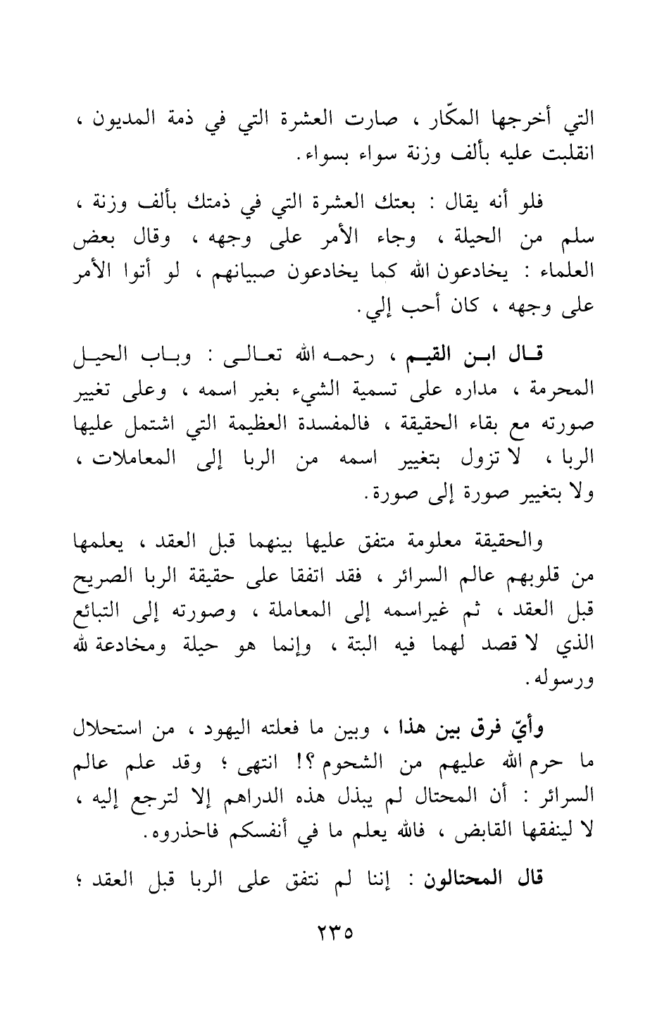 فلو أنه يقال: بعتك العشرة التي في ذمتك بألف وزنة، سلم من الحيلة، وجاء الأمر على وجهه. وقال بعض العلماء: يخادعون الله كما يخادعون صبيانهم، لو أتوا الأمر على وجهه، كان أحب إلي.