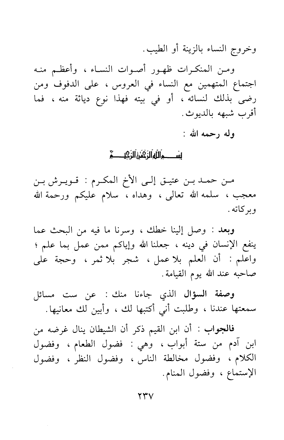 من حمد بن عتيق إلى الأخ المكرم: قويرش بن معجب، سلمه الله تعالى، وهداه، سلام عليكم ووحمة الله وبركاته.
