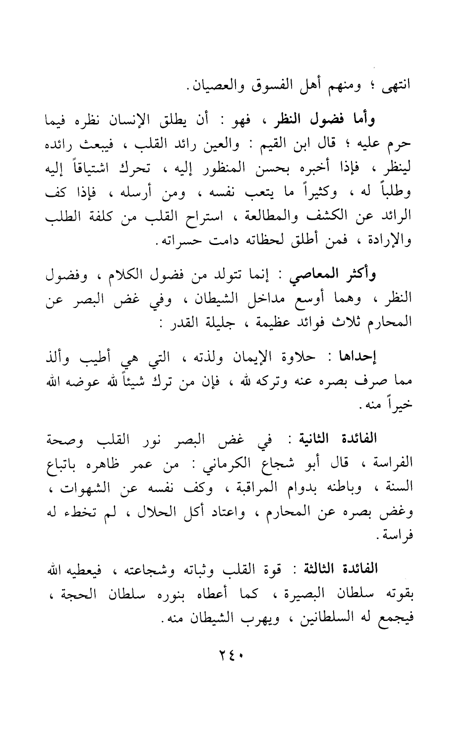 وأكثر المعاصي إنما تتولد من فضول الكلام، وفضول النظر، وهما أوسع مداخل الشيطان، وفي غض البصر عن المحارم ثلاث فوائد عظيمة، جليلة القدر: