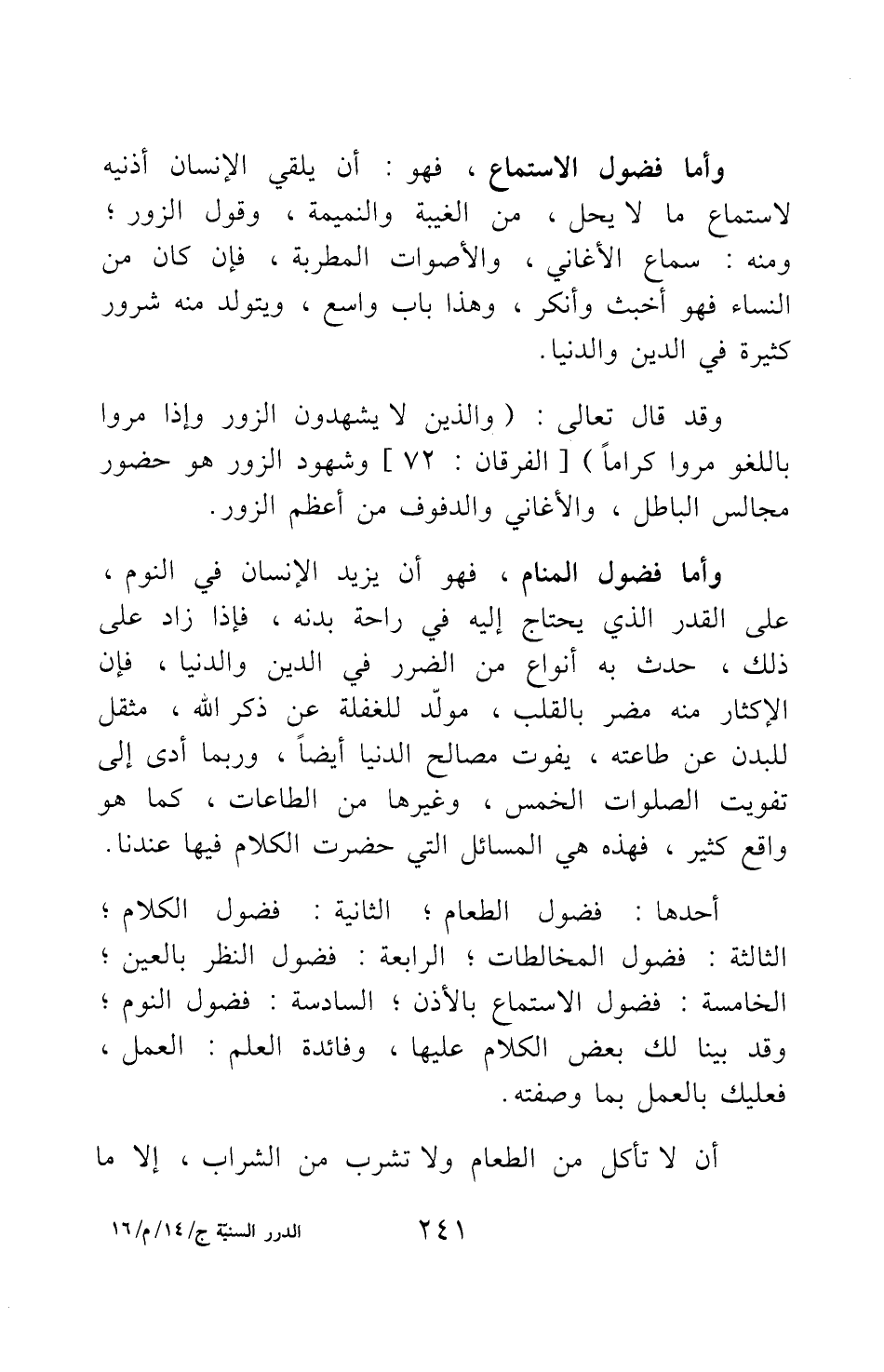 وأما فضول الاستماع، فهو: أن يلقي الإنسان أذنيه لاستماع ما لا يحل، من الغيبة والنميمة، وقول الزور; ومنه: سماع الأغاني، والأصوات المطربة؛ فإن كان من النساء فهو أخبث وأنكر؛ وهذا باب واسع، ويتولد منه شرور كثيرة في الدين والدنيا. وقد قال تعالى: {وَالَّذِينَ لا يَشْهَدُونَ الزُّورَ وَإِذَا مَرُّوا بِاللَّغْوِ مَرُّوا كِرَاماً} [سورة الفرقان آية: 72] ، وشهود الزور هو حضور مجالس الباطل، والأغاني والدفوف من أعظم الزور.