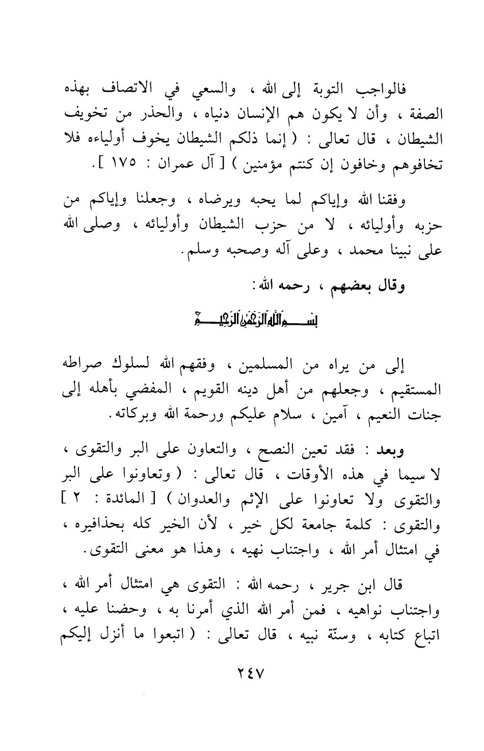 إلى من يراه من المسلمين، وفقهم الله لسلوك صراطه المستقيم، وجعلهم من أهل دينه القويم، المفضي بأهله إلى جنات النعيم، آمين. سلام عليكم ورحمة الله وبركاته.