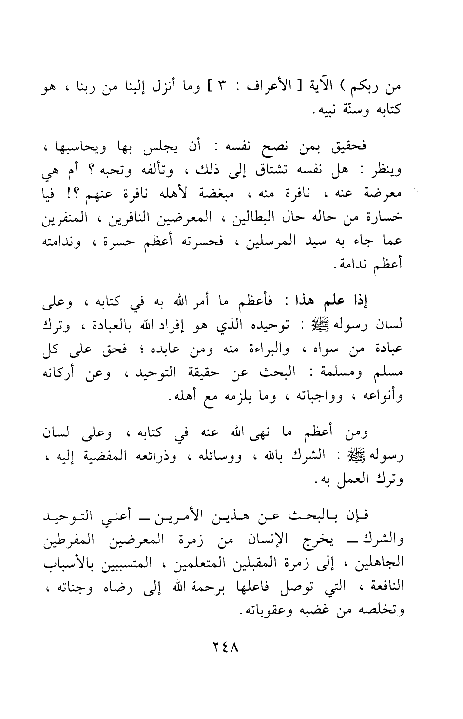 فإن بالبحث عن هذين الأمرين - أعني التوحيد والشرك - يخرج الإنسان من زمرة المعرضين المفرطين الجاهلين، إلى زمرة المقبلين المتعلمين، المتسببين بالأسباب النافعة، التي توصل فاعلها برحمة الله إلى رضاه وجناته، وتخلصه من غضبه وعقوباته.