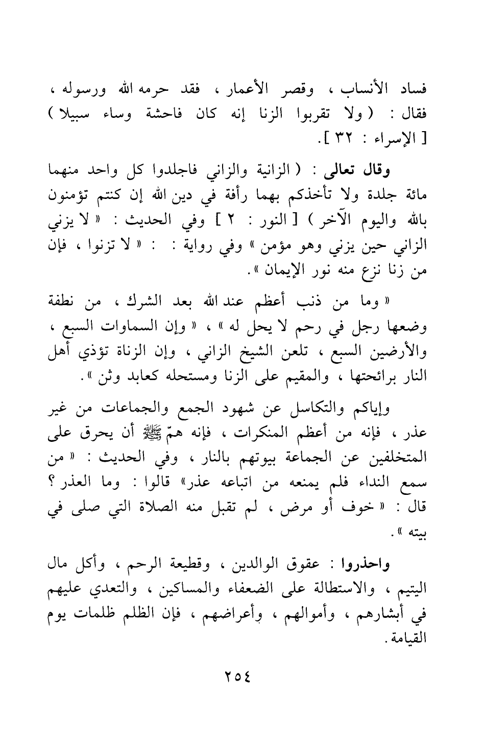 وما من ذنب أعظم عند الله بعد الشرك، من نطفة وضعها رجل في رحم لا يحل له وإن السماوات السبع، والأرضين السبع، تلعن الشيخ الزاني، وإن الزناة تؤذي أهل النار برائحتها، والمقيم على الزنا ومستحله كعابد وثن.