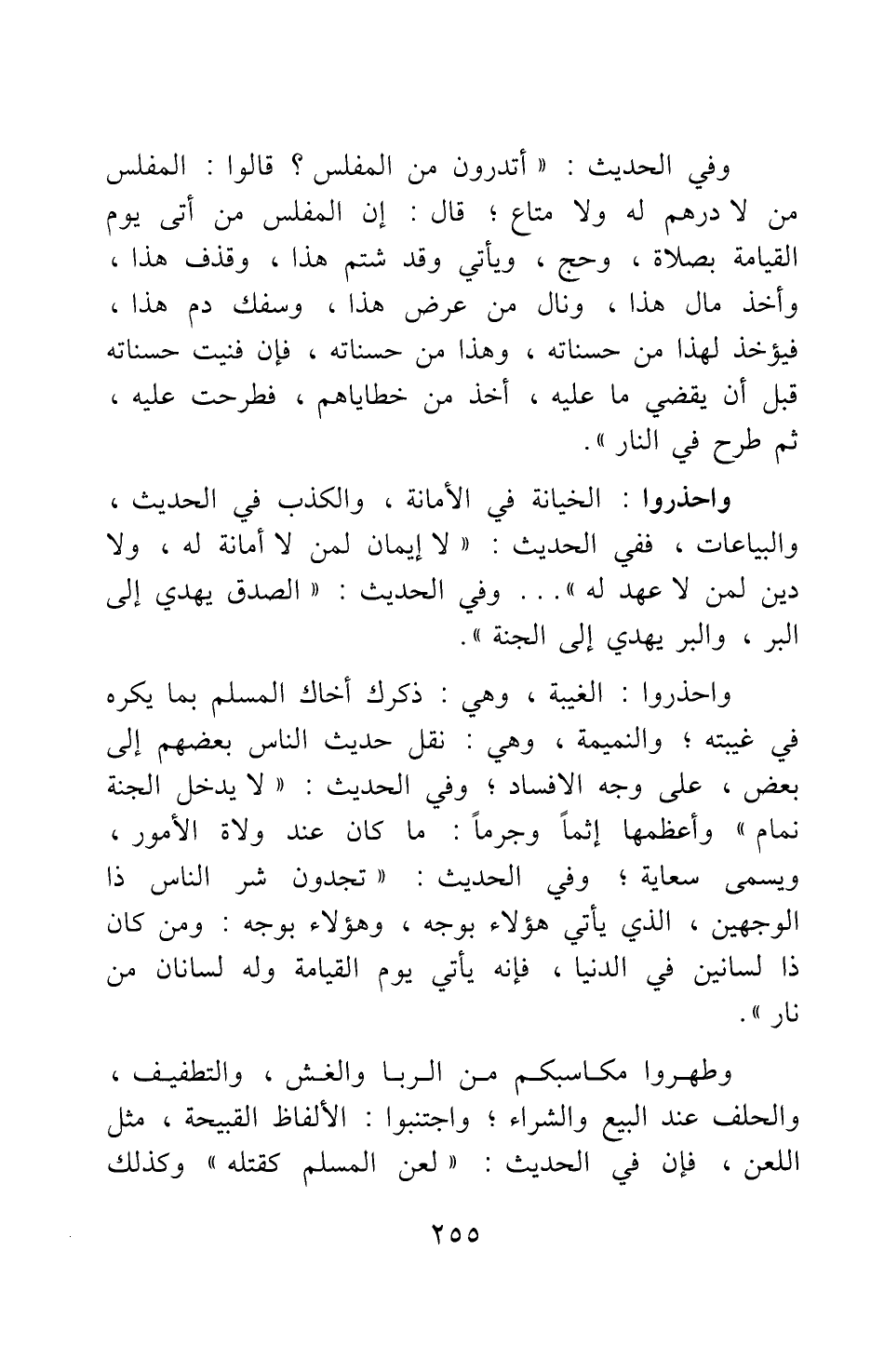 وطهروا مكاسبكم من الربى والغش، والتطفيف، والحلف عند البيع والشراء; واجتنبوا الألفاظ القبيحة، مثل اللعن، فإن في الحديث: لعن المسلم كقتله 6 وكذلك