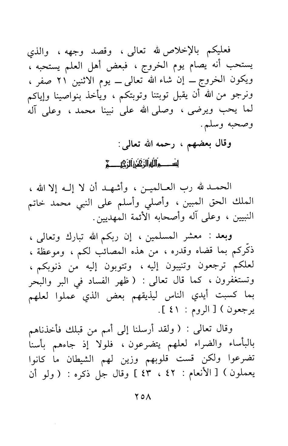 وبعد: معشر المسلمين، إن ربكم الله تبارك وتعالى، ذكركم بما قضاه وقدره، من هذه المصائب لكم، وموعظة، لعلكم ترجعون وتنيبون إليه، وتتوبون إليه من ذنوبكم، وتستغفرون، كما قال تعالى: {ظَهَرَ الْفَسَادُ فِي الْبَرِّ وَالْبَحْرِ بِمَا كَسَبَتْ أَيْدِي النَّاسِ لِيُذِيقَهُمْ بَعْضَ الَّذِي عَمِلُوا لَعَلَّهُمْ يَرْجِعُونَ} [سورة الروم آية: 41] .