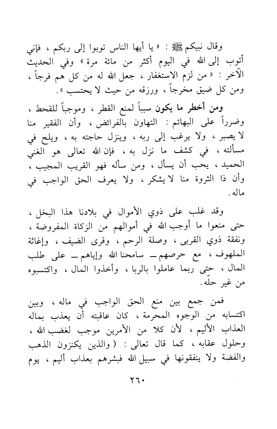 ومن أخطر ما يكون سببا لمنع القطر، وموجبا للقحط، وضررا على البهائم: التهاون بالفرائض، وأن الفقير منا لا يصبر، ولا يرغب إلى ربه وينْزل حاجته به، ويلح في مسألته في كشف ما نزل به، فإن الله تعالى هو الغني الحميد، يحب أن يسأل، ومن سأله فهو القريب المجيب؛ وأن ذا الثروة منا لا يشكر، ولا يعرف الحق الواجب في ماله.