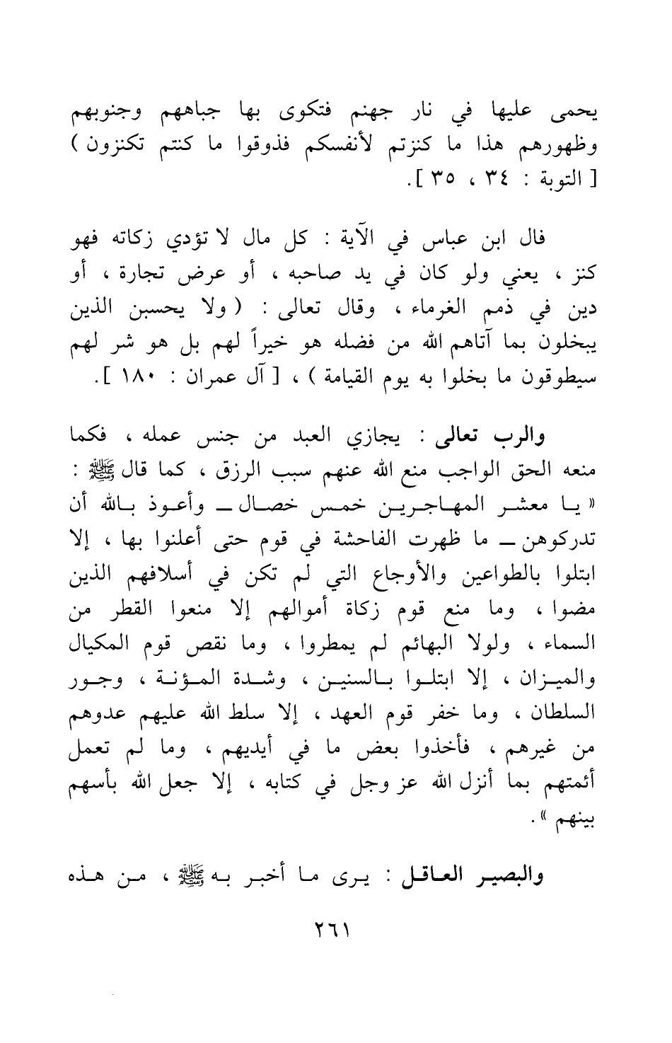 قال ابن عباس في الآية: كل مال لا تؤدي زكاته فهو كنْز، يعني ولو كان في يد صاحبه، أو عرض تجارة، أو دين في ذمم الغرماء، وقال تعالى: {وَلا يَحْسَبَنَّ الَّذِينَ يَبْخَلُونَ بِمَا آتَاهُمُ اللَّهُ مِنْ فَضْلِهِ هُوَ خَيْراً لَهُمْ بَلْ هُوَ شَرٌّ لَهُمْ سَيُطَوَّقُونَ مَا بَخِلُوا بِهِ يَوْمَ الْقِيَامَةِ} [سورة آل عمران آية: 180] .