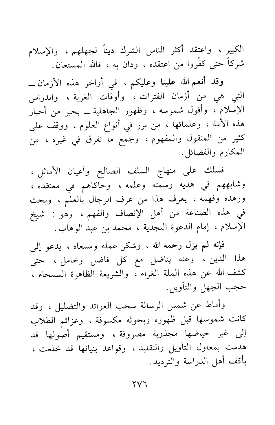 فسلك على منهاج السلف الصالح وأعيان الأماثل، وشابههم في هديه وسمته وعلمه، وحاكاهم في معتقده، وزهده وفهمه، يعرف هذا من عرف الرجال بالعلم، وبحث في هذه الصناعة من أهل الإنصاف والفهم، وهو: شيخ الإسلام، إمام الدعوة النجدية، محمد بن عبد الوهاب.
