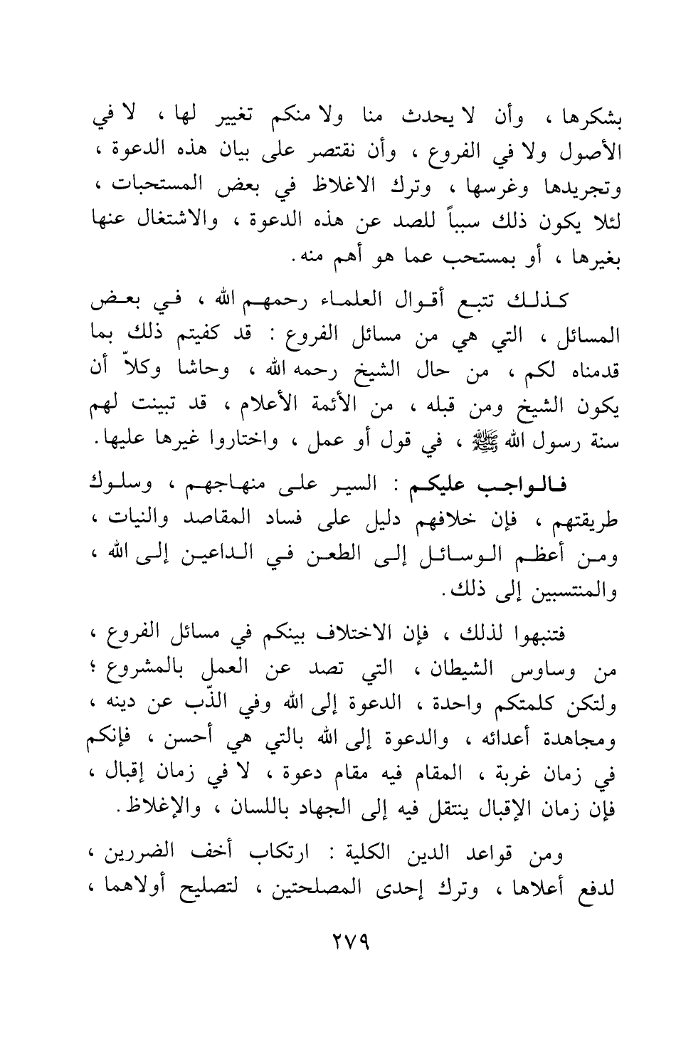 بشكرها، وأن لا يحدث منا ولا منكم تغيير لها، لا في الأصول ولا في الفروع؛ وأن نقتصر على بيان هذه الدعوة، وتجريدها وغرسها، وترك الإغلاظ في بعض المستحبات، لئلا يكون ذلك سببا للصد عن هذه الدعوة، والاشتغال عنها بغيرها، أو بمستحب عما هو أهم منه.