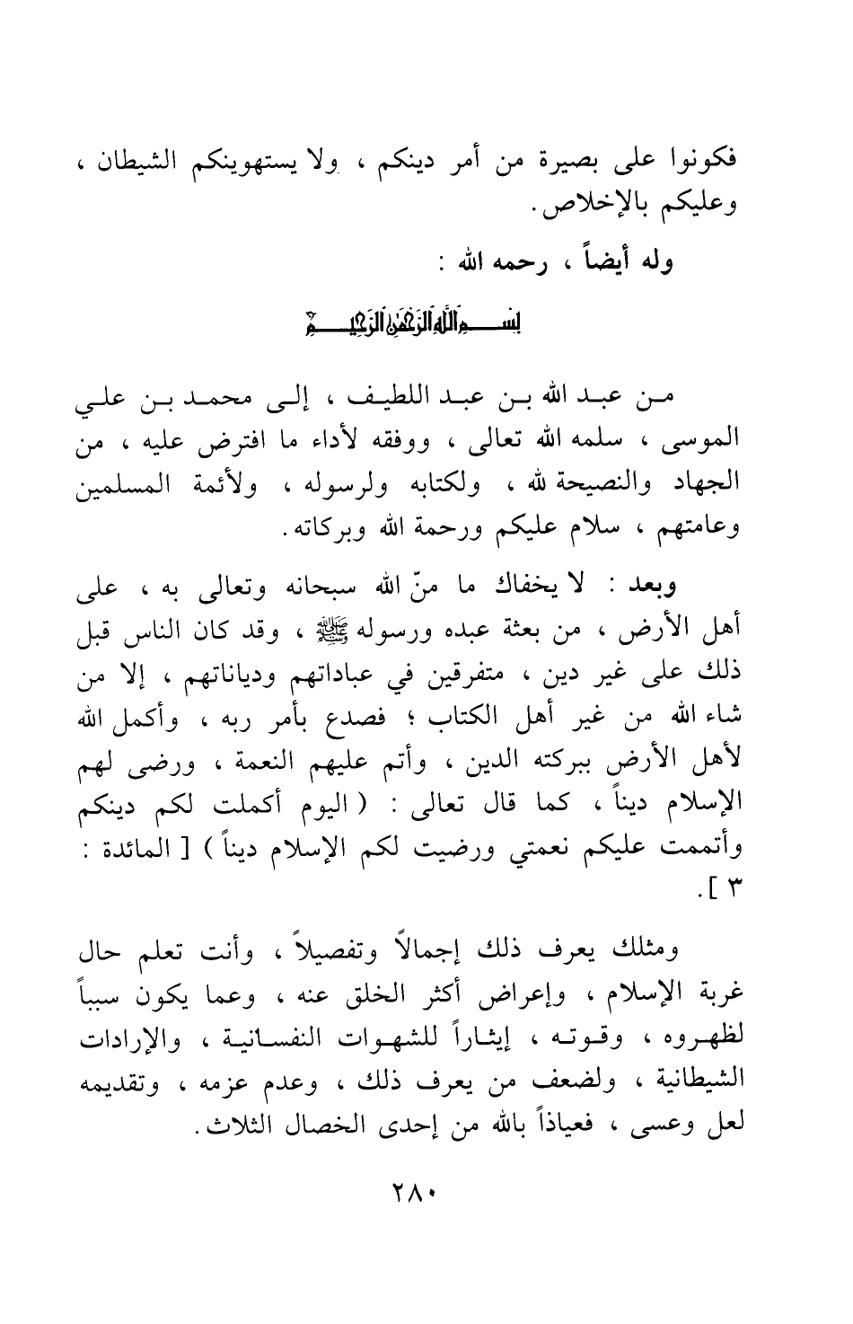 من عبد الله بن عبد اللطيف، إلى محمد بن علي الموسى، سلمه الله تعالى، ووفقه لأداء ما افترض عليه، من الجهاد والنصيحة لله، ولكتابه ولرسوله، ولأئمة المسلمين وعامتهم، سلام عليكم ورحمة الله وبركاته.