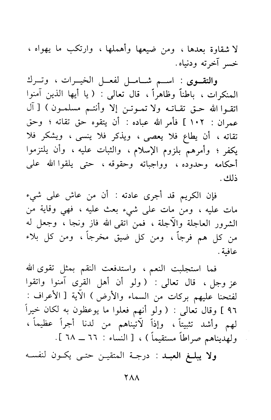 والتقوى: اسم شامل لفعل الخيرات، وترك المنكرات، باطنا وظاهرا، قال تعالى {يَا أَيُّهَا الَّذِينَ آمَنُوا اتَّقُوا اللَّهَ حَقَّ تُقَاتِهِ وَلا تَمُوتُنَّ إِلاّ وَأَنْتُمْ مُسْلِمُونَ} [سورة آل عمران آية: 102] ، فأمر الله عباده أن يتقوه حق تقاته; وحق تقاته: أن يطاع فلا يعصى، ويذكر فلا ينسى، ويشكر فلا يكفر; وأمرهم بلزوم الإسلام، والثبات عليه، وأن يلتزموا أحكامه وحدوده، وواجباته وحقوقه، حتى يلقوا الله على ذلك.